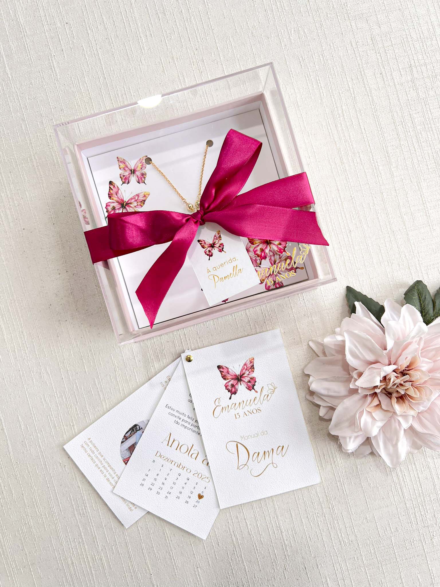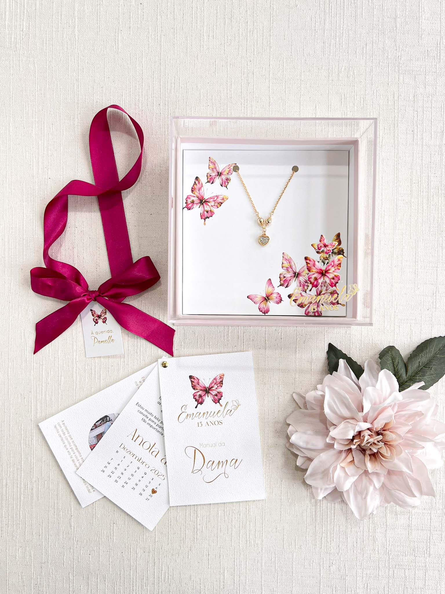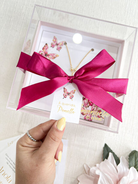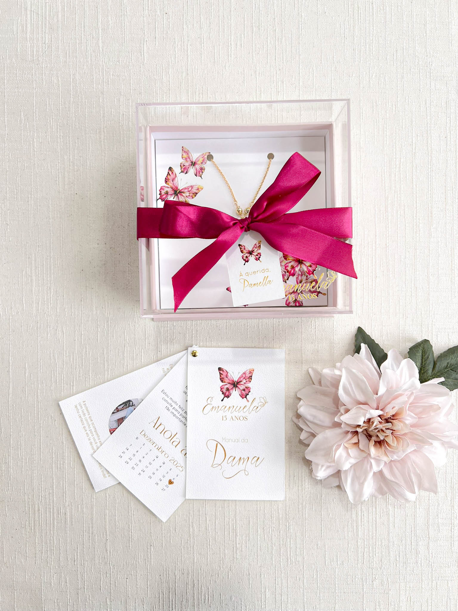 Apenas MADRINHA/MÃE: caixa com todos os itens, exceto a gravata que não acompanha essa versão.