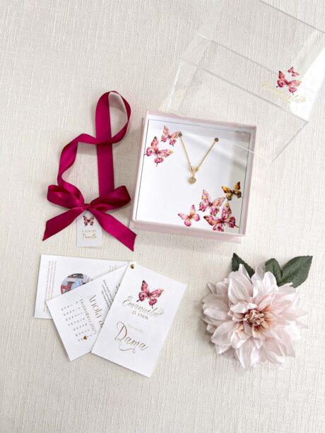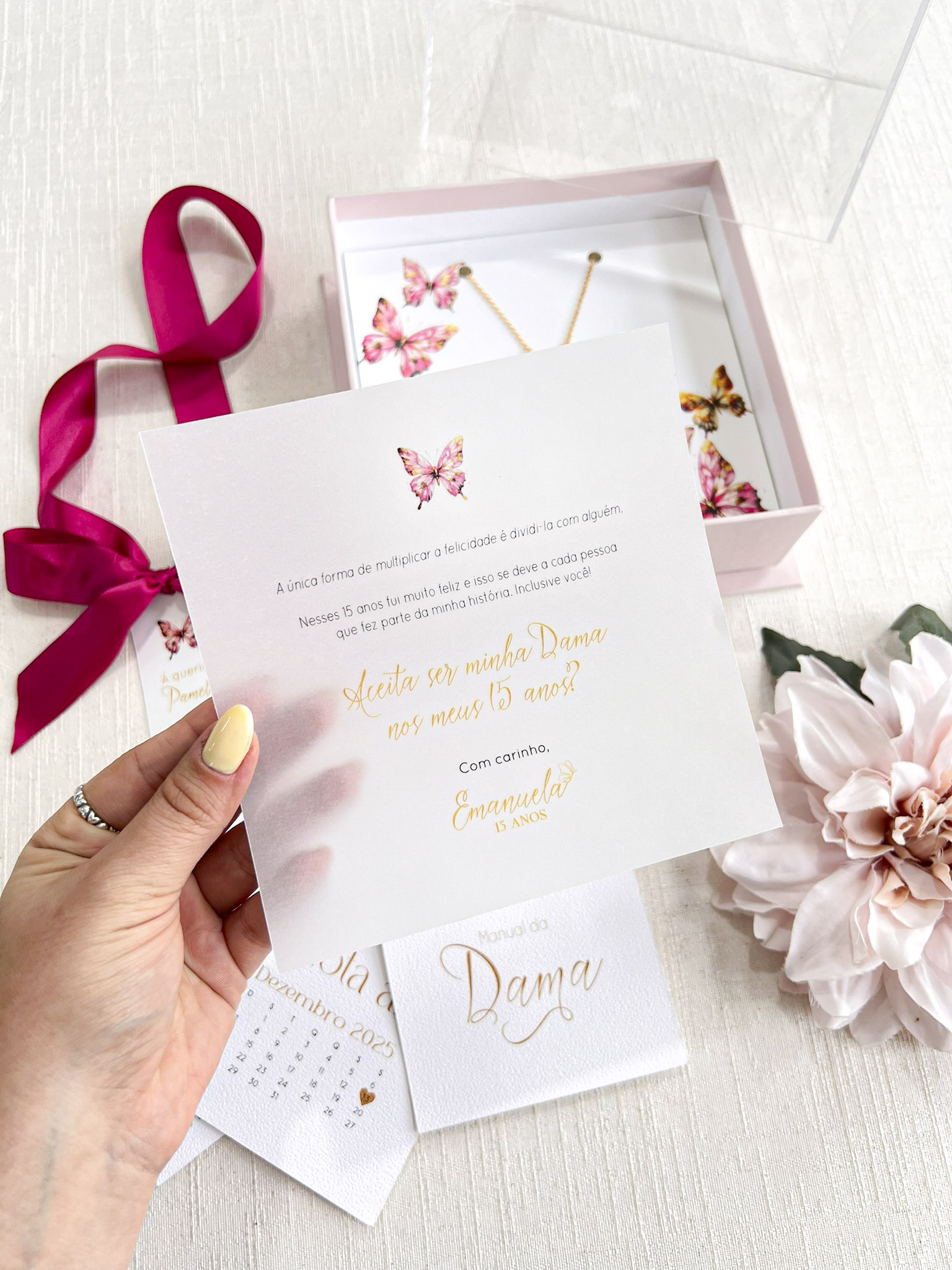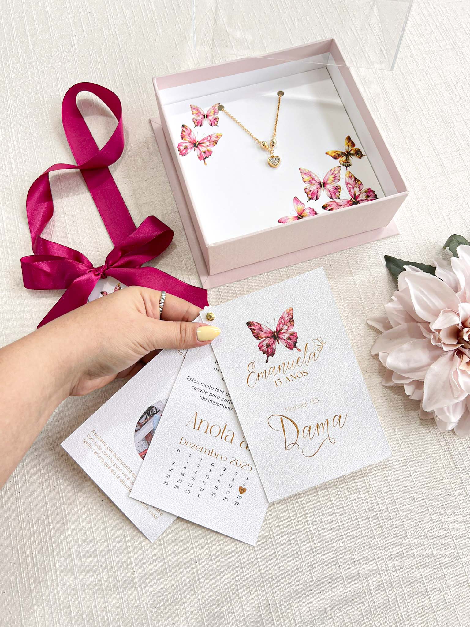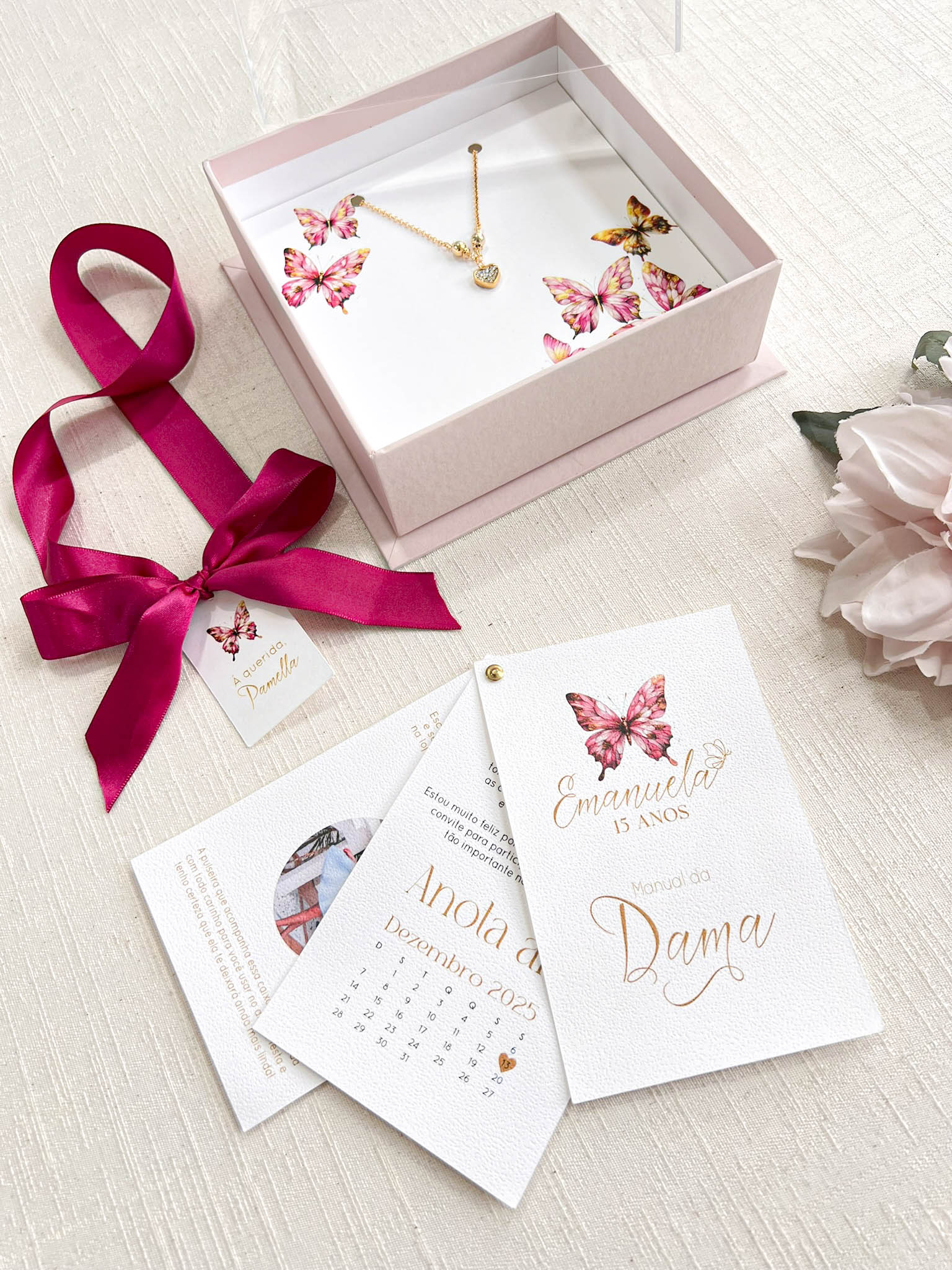 Apenas MADRINHA/MÃE: caixa com todos os itens, exceto a gravata que não acompanha essa versão.