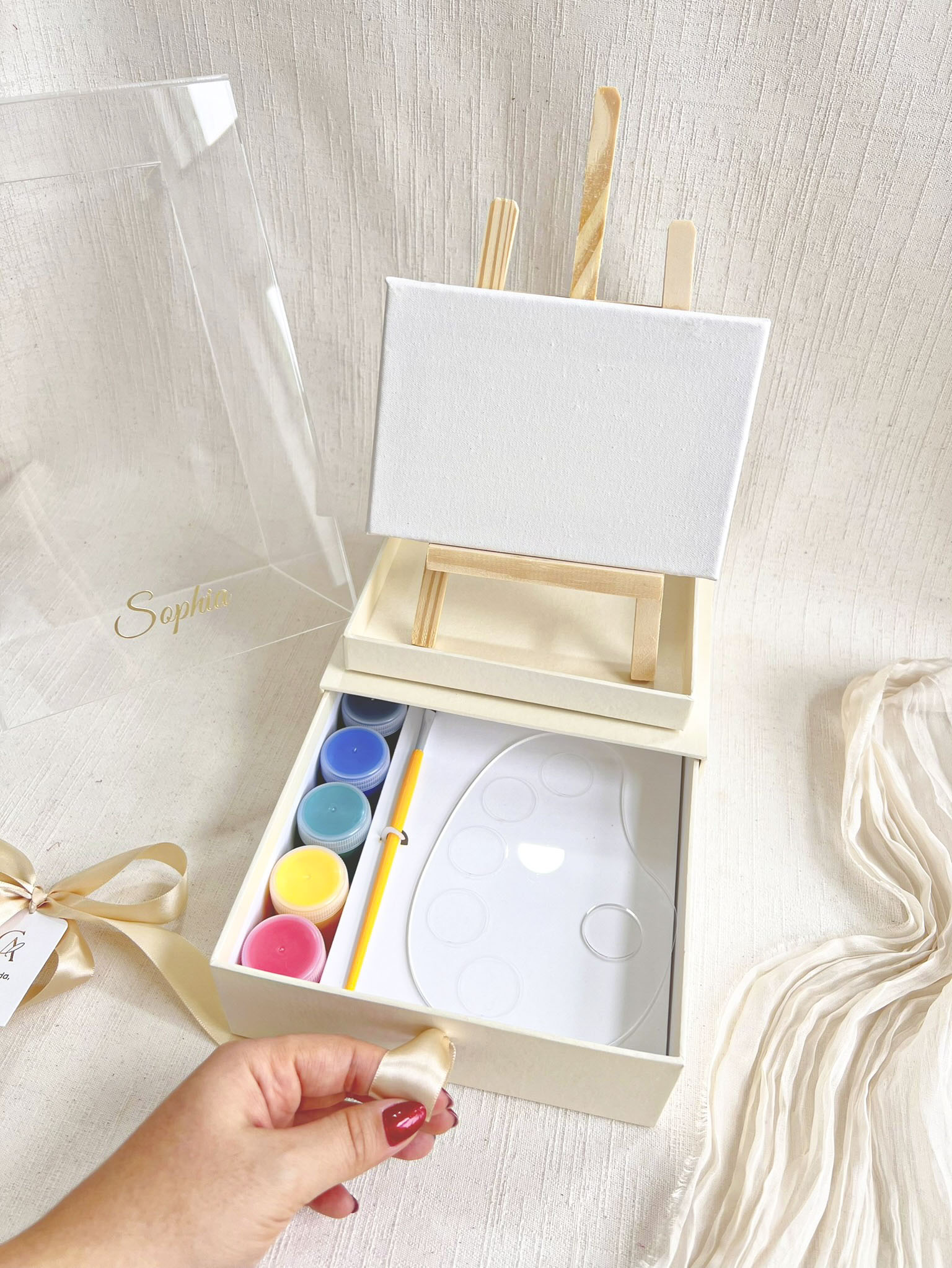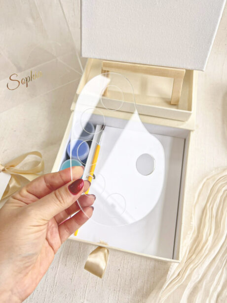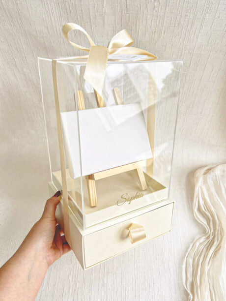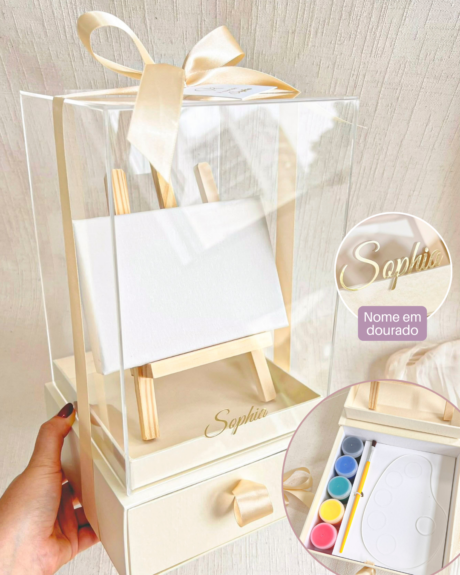 Caixa Acrílica c/ gaveta 16x16x22cm (Cartonagem + TAMPA ACRÍLICO) Nome Metalizado – Tela 10x15cm + Kit Pintura