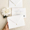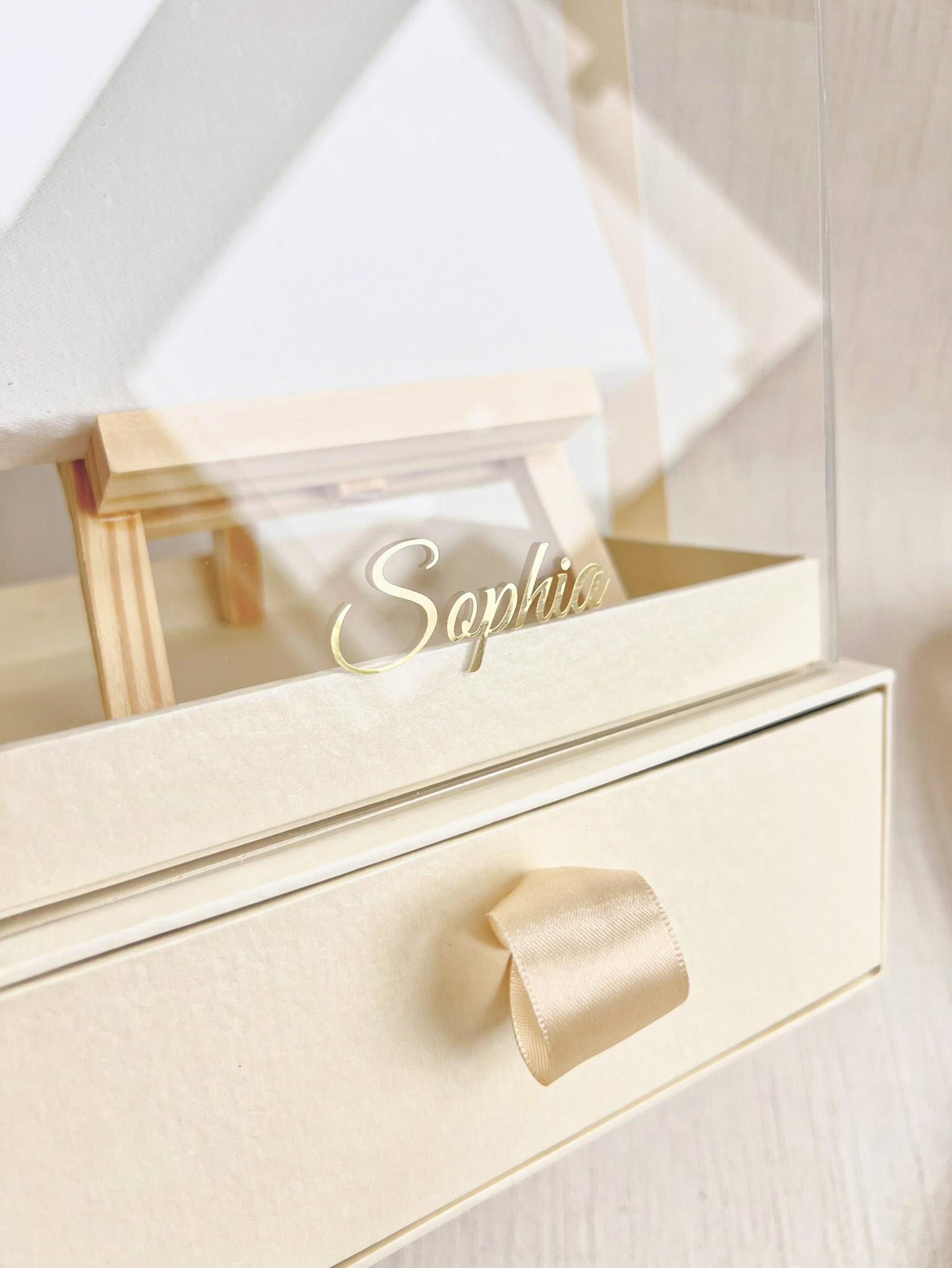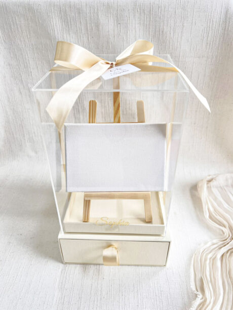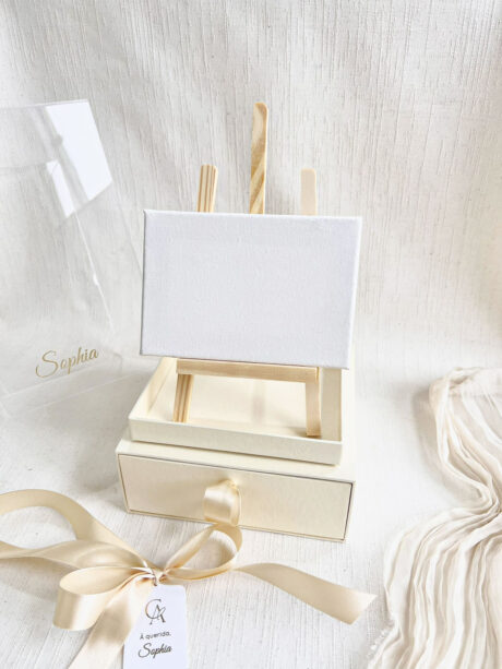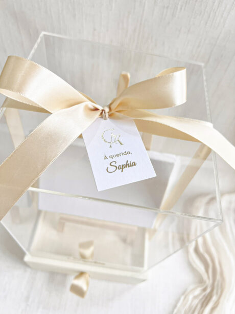 O box pode ser ajustado conforme o estilo do casal, e a tampa acrílica traz o monograma ou nome da criança em dourado, garantindo um toque sofisticado e inesquecível.