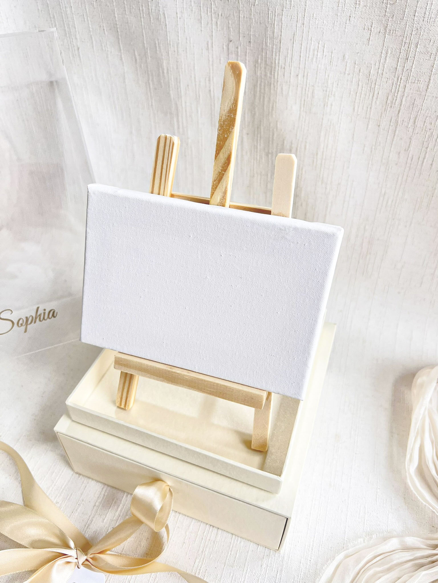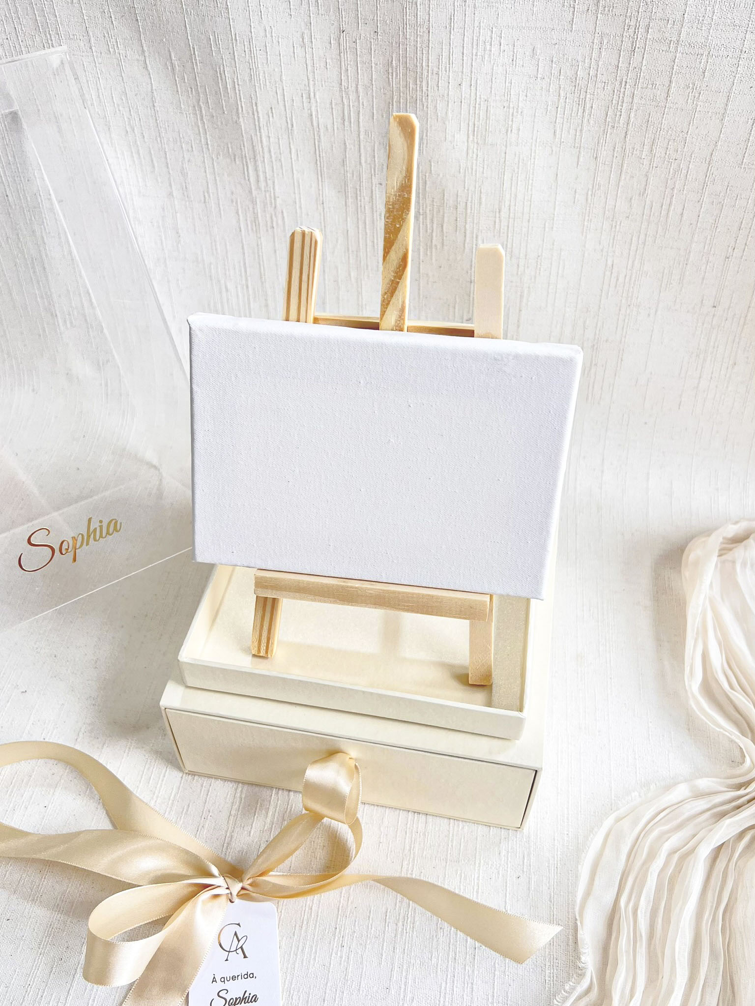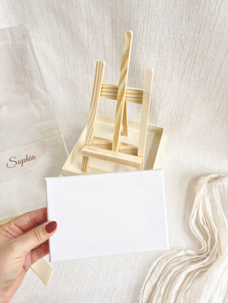 * Gaveteiro com puxador em cetim - * Tela 10x15cm com cavalete em madeira crua
