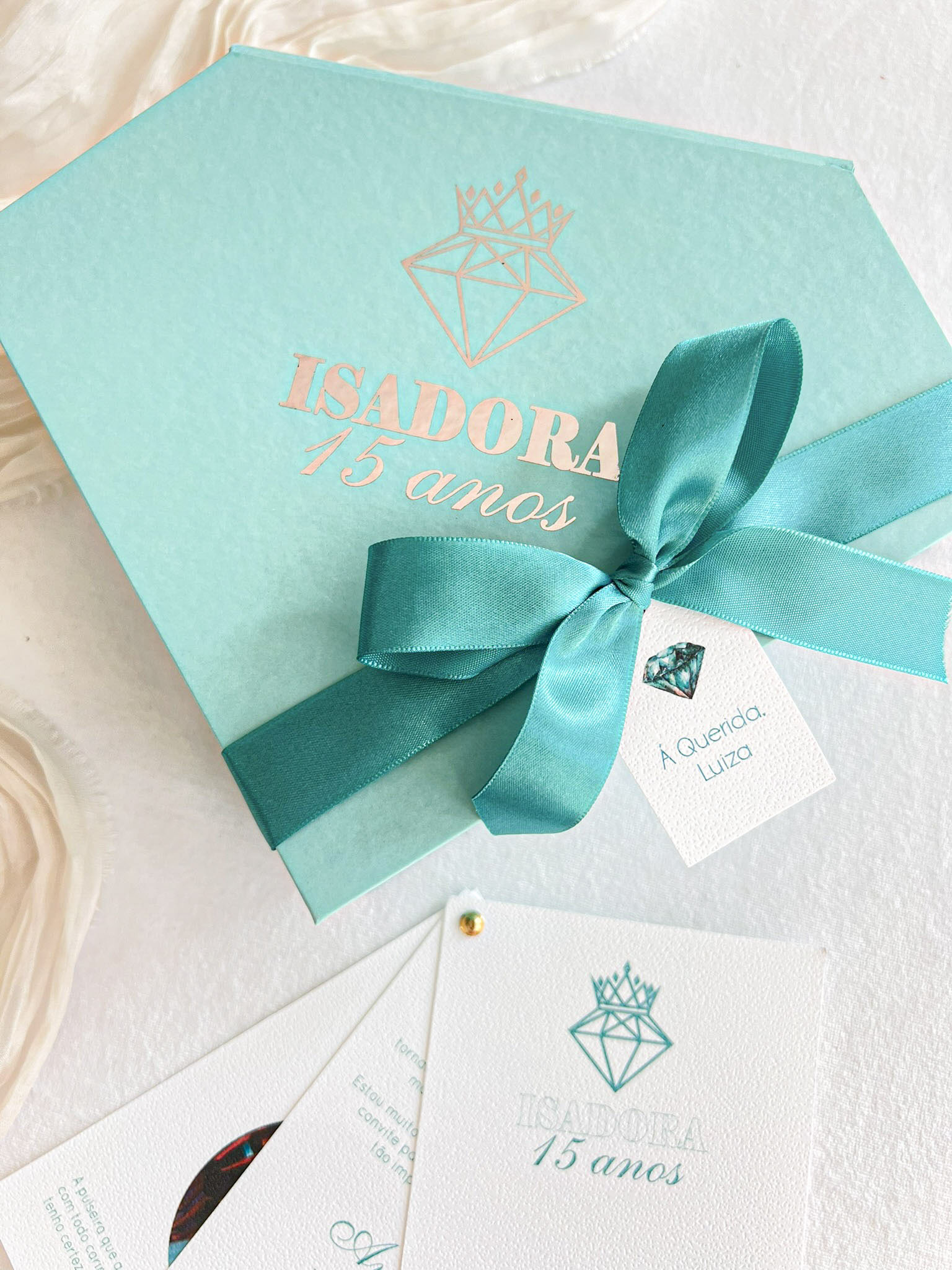 A caixa mais diferente e sofisticada que você poderia escolher! Tem um formato de diamante, fica incrível para festas com temáticas similares.