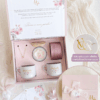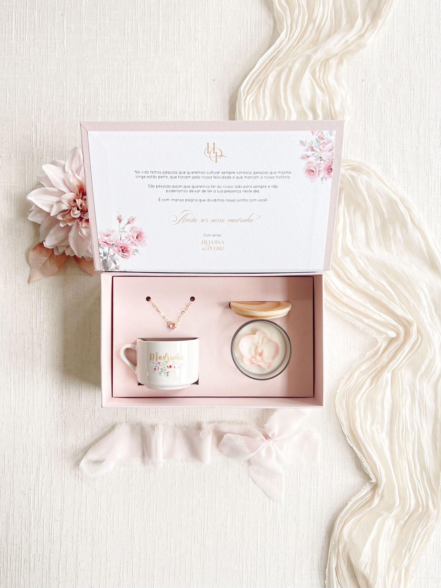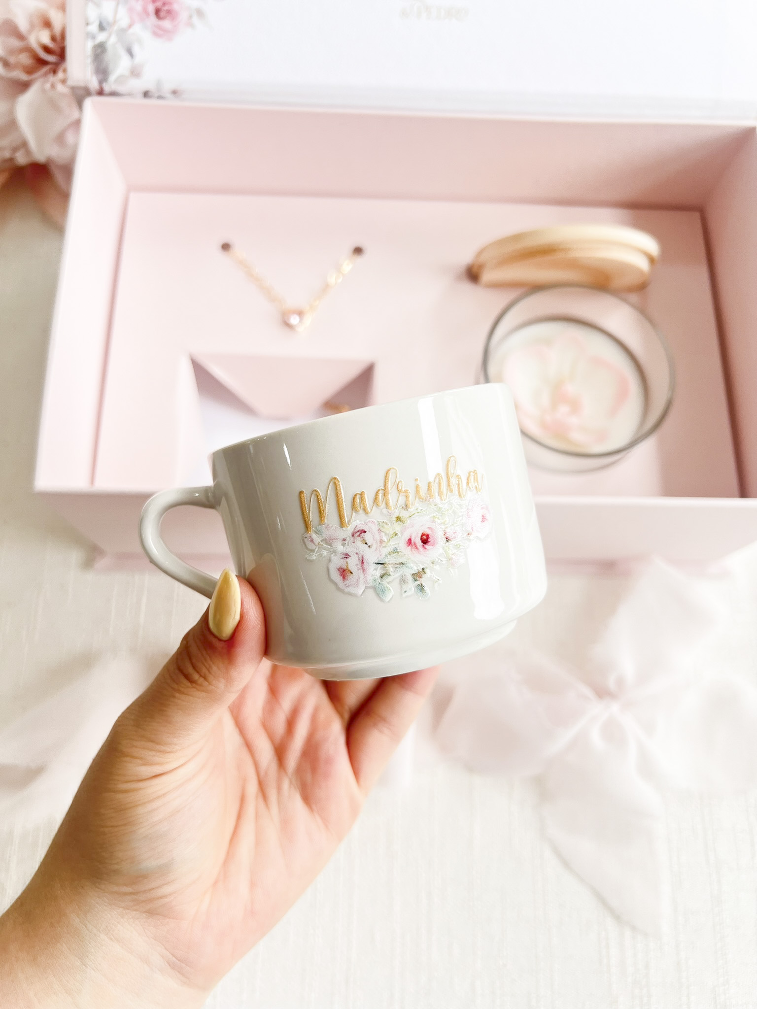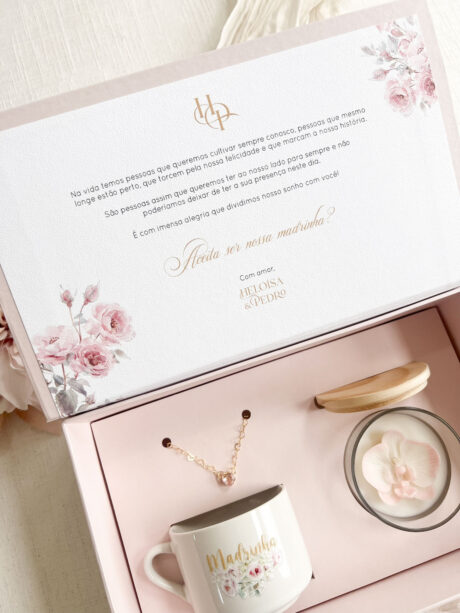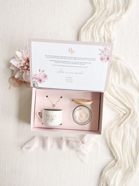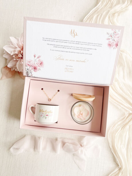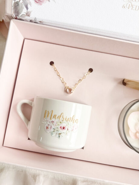Caixa Quartzo – Madrinha/Mãe Completa – Cartonagem (Xícara, Pulseira, Vela aromática) Cod. 1003