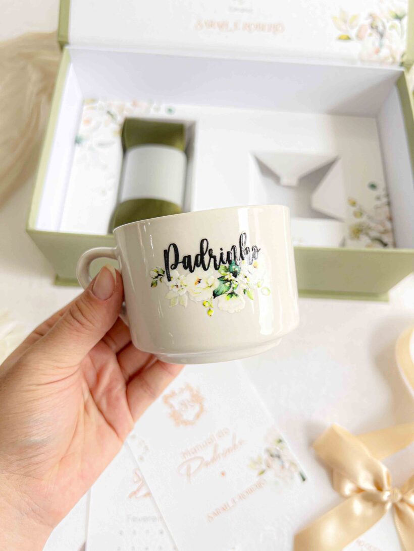 Podemos mudar os florais, paleta de cores, fotos de inspiração, escritas e layout para ficar do jeitinho que você precisa, a fita para fechamento, escrita das xícaras podem ser em outra cor que temos em nosso portfólio.