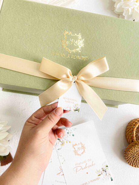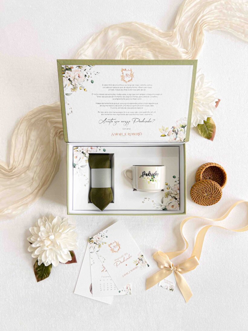 Apenas MADRINHA/MÃE: caixa com todos os itens, exceto a gravata que não acompanha essa versão.