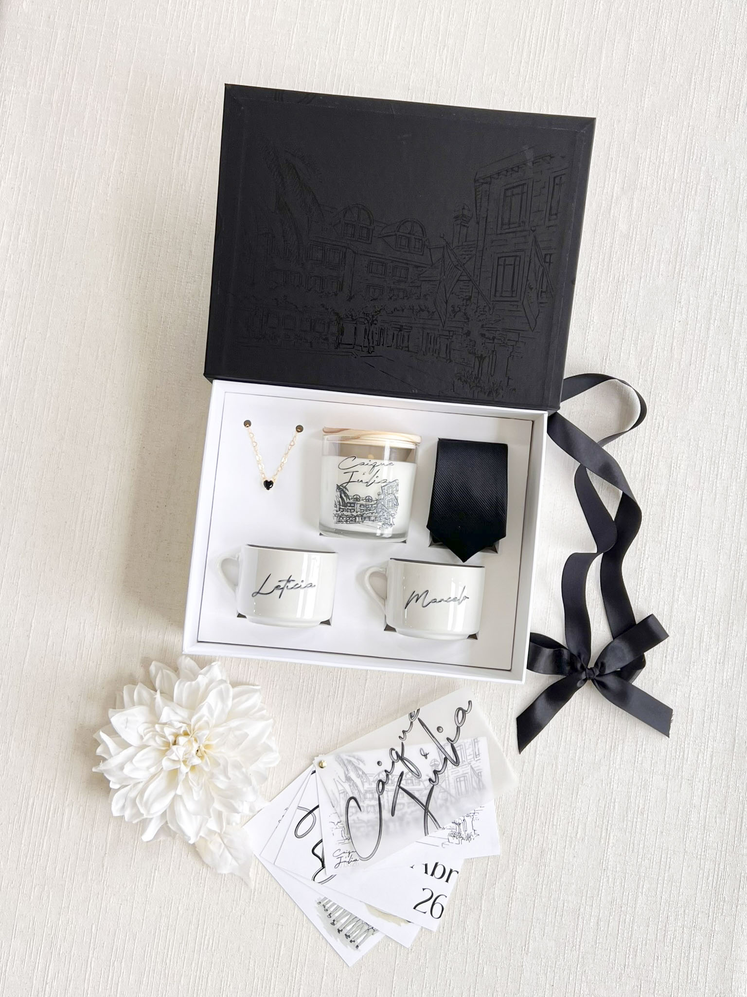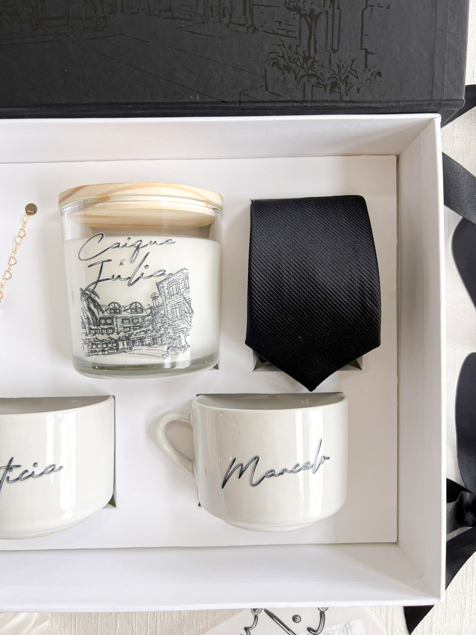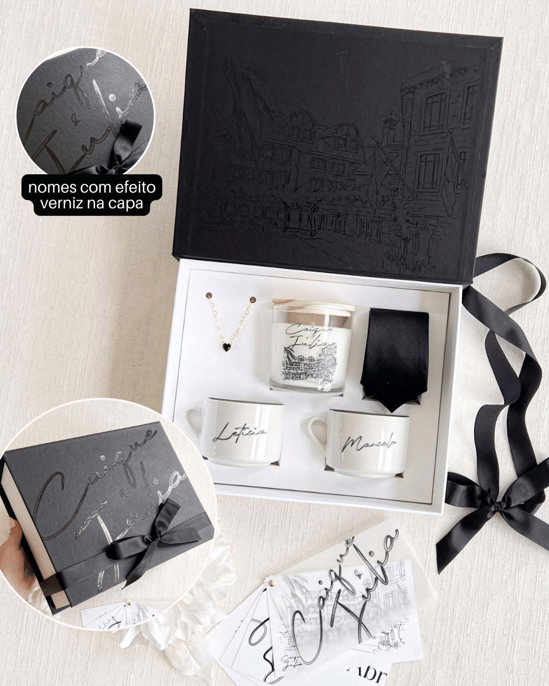 Caixa Turmalina – Casal Completa – Cartonagem efeito verniz (Xícaras, Gravata, Pulseira, Vela aromática 265ml) Cod. 1006
