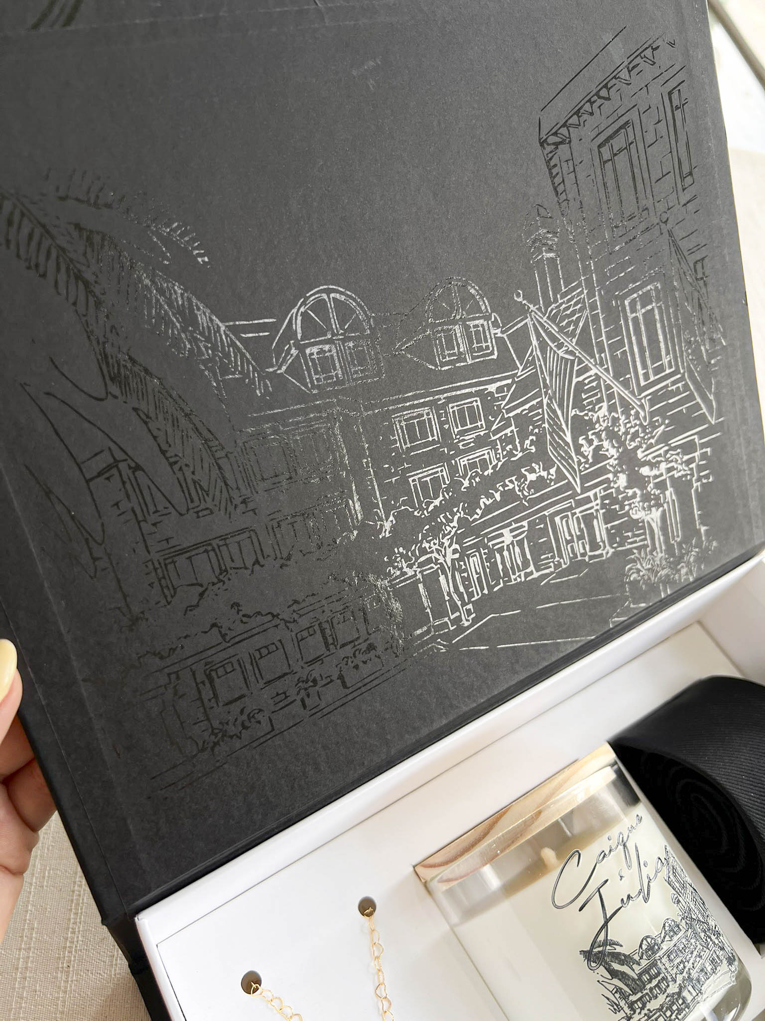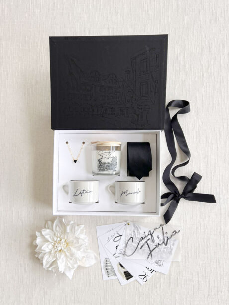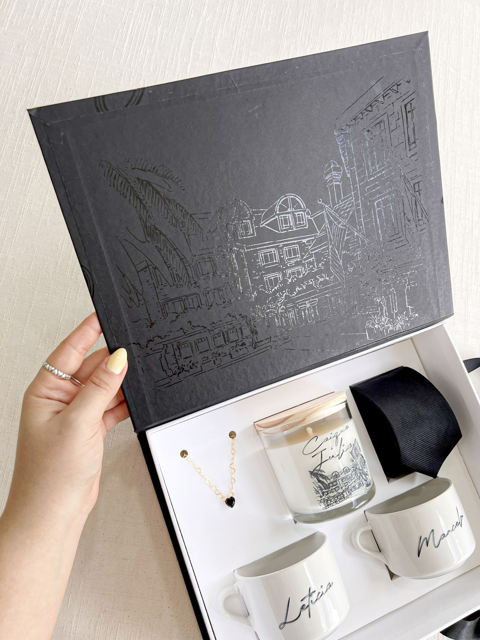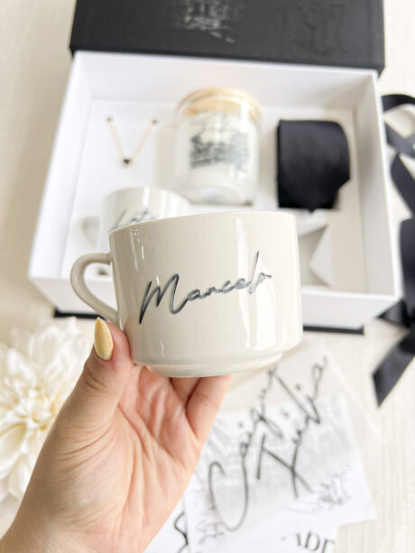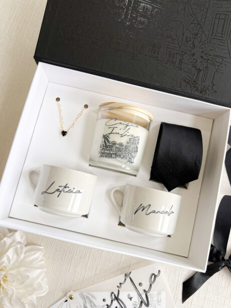 Caixa Turmalina – Casal Completa – Cartonagem efeito verniz (Xícaras, Gravata, Pulseira, Vela aromática 265ml) Cod. 1006