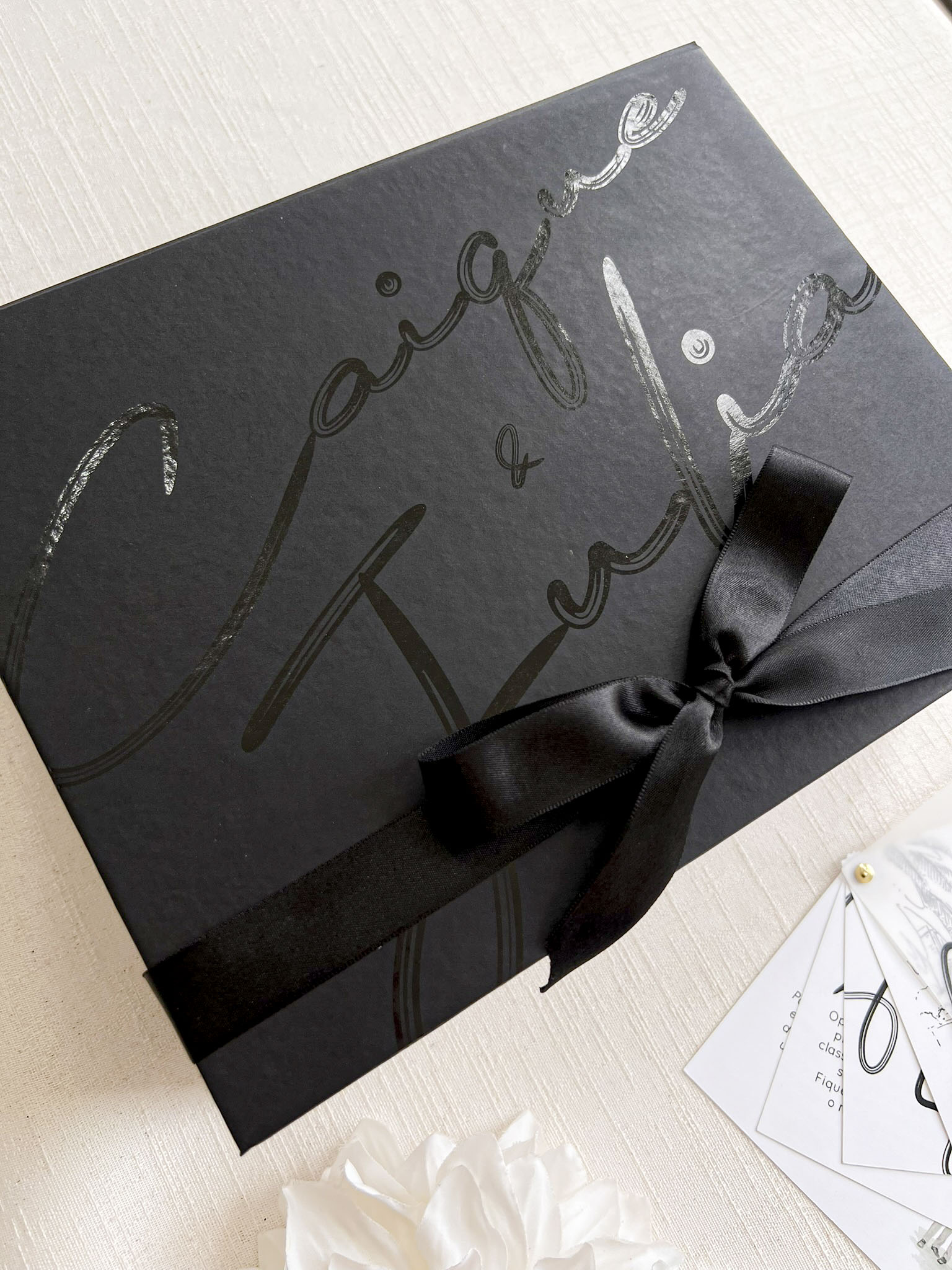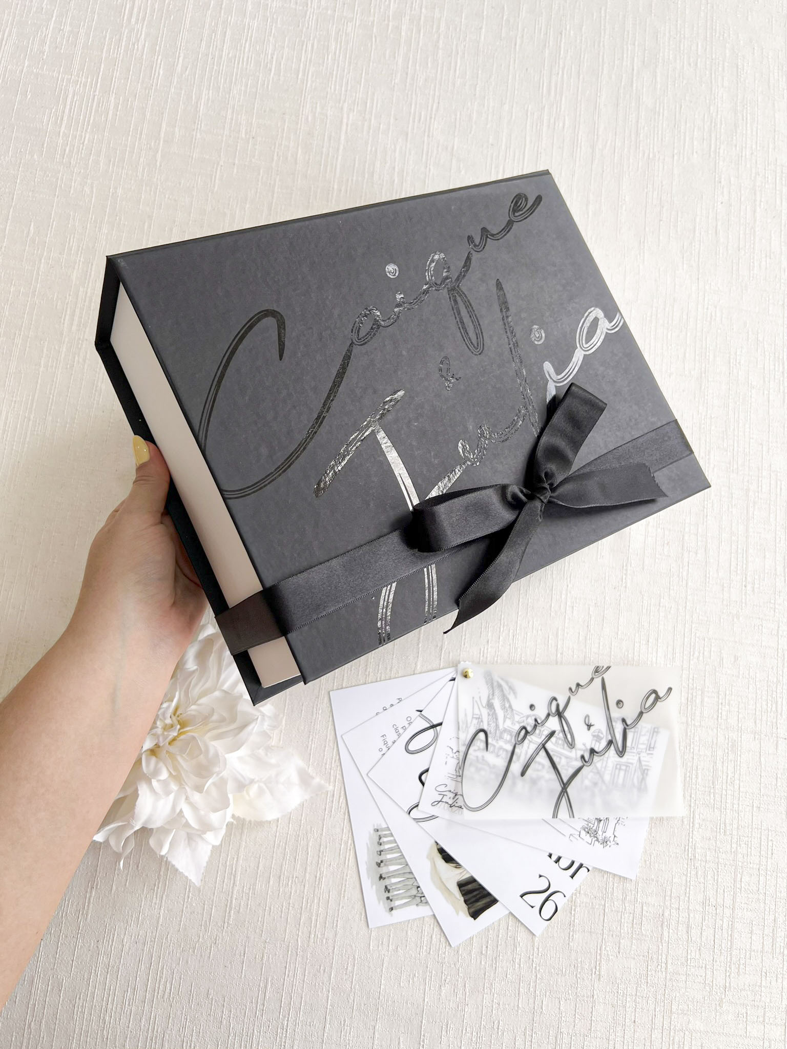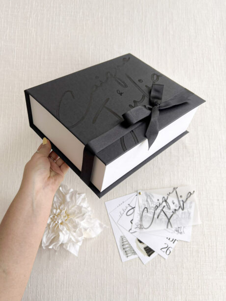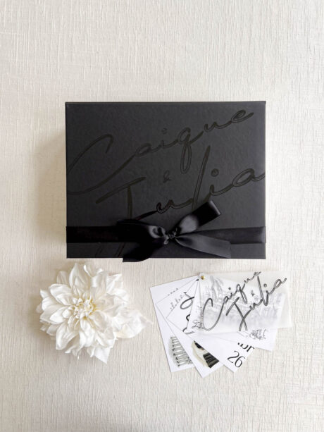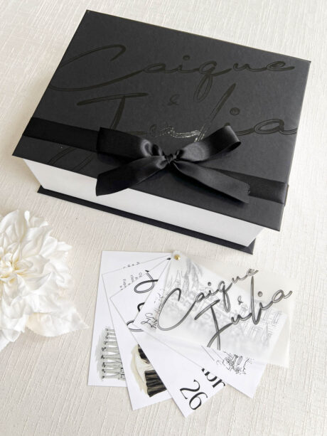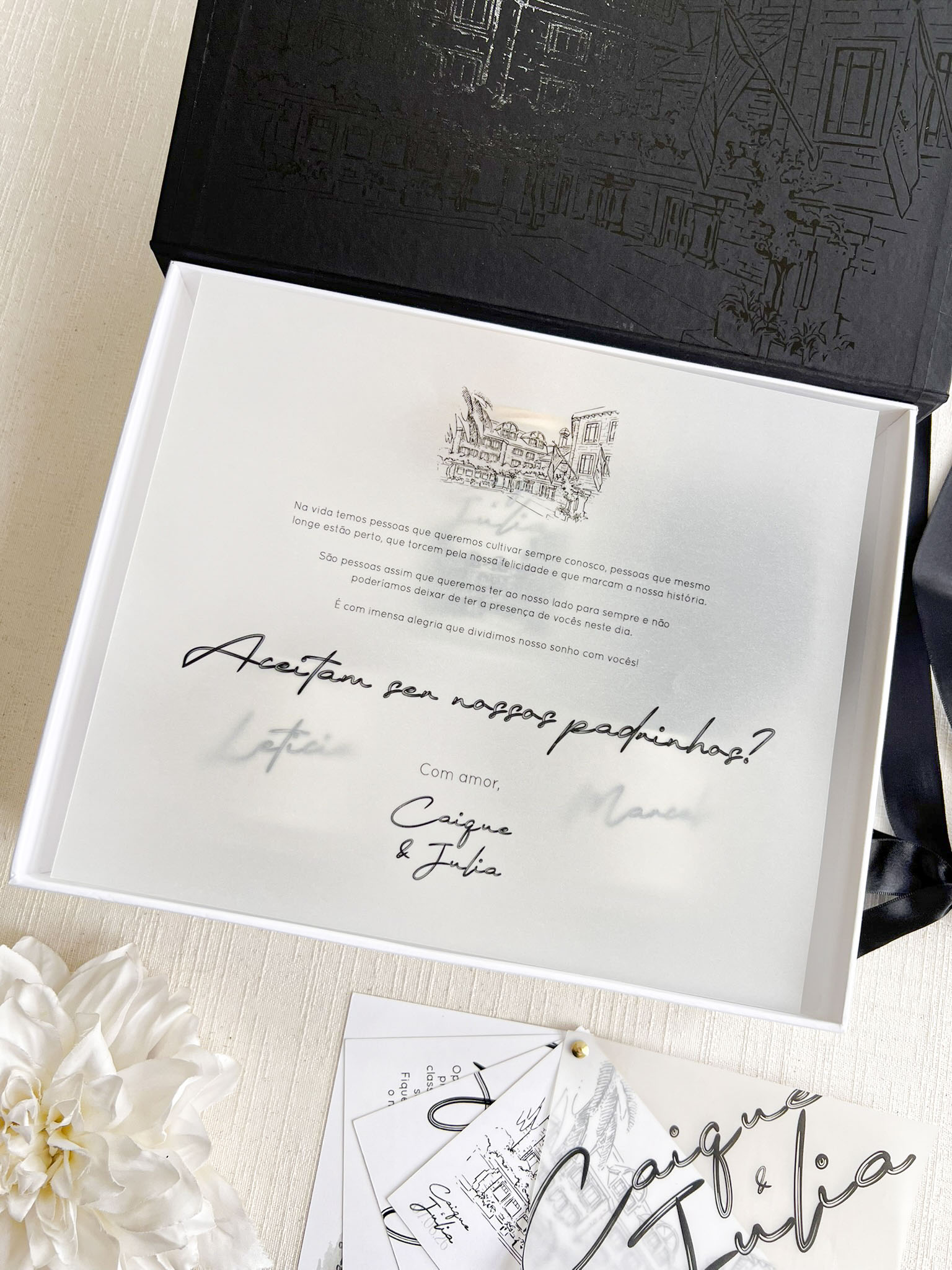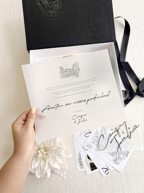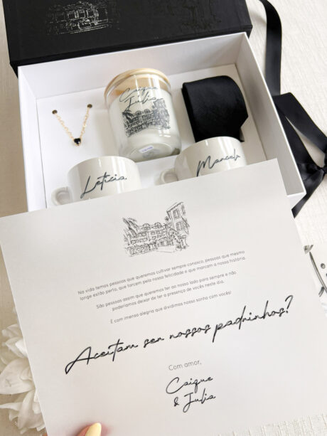 A Caixa Turmalina foi criada para presentear padrinhos e pais com elegância e significado. Com design sofisticado e acabamento artesanal, cada detalhe é pensado para transformar o convite em um momento especial e inesquecível.