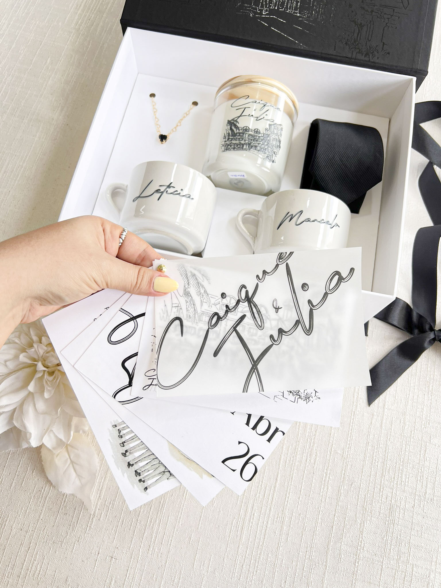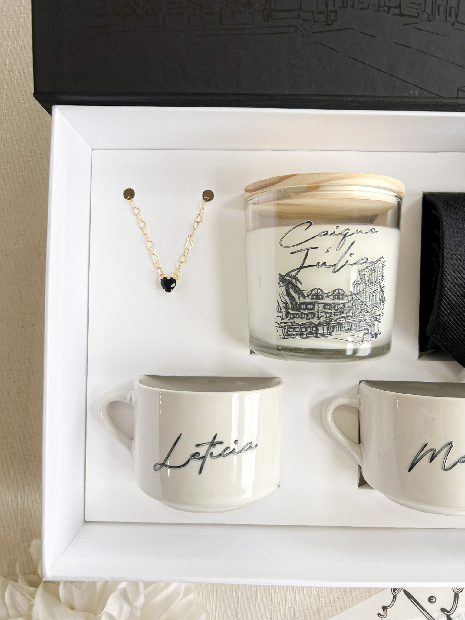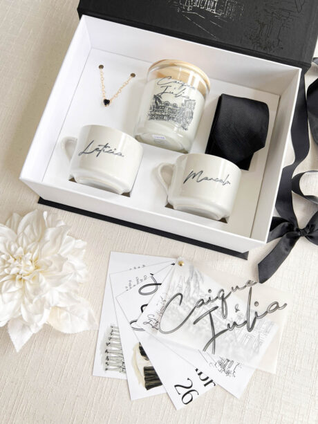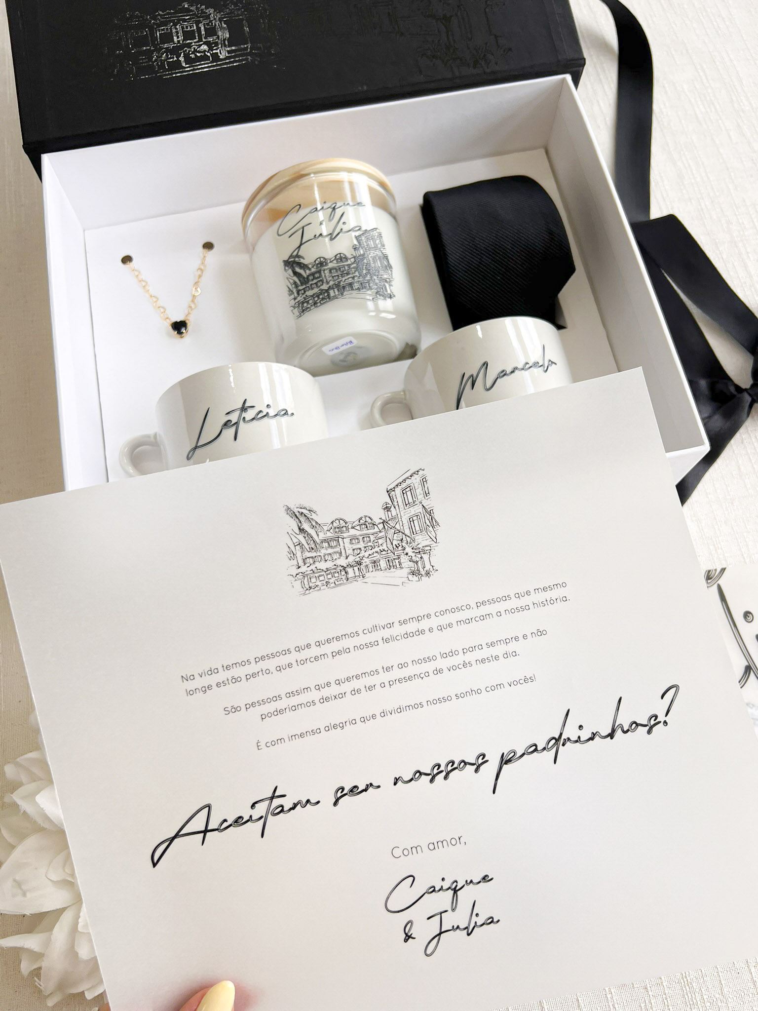 Apenas MADRINHA/MÃE: caixa com todos os itens, exceto a gravata e 1 xícara que não acompanha essa versão.