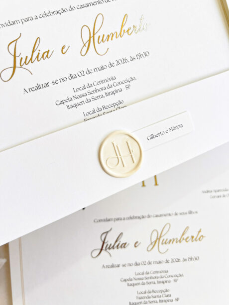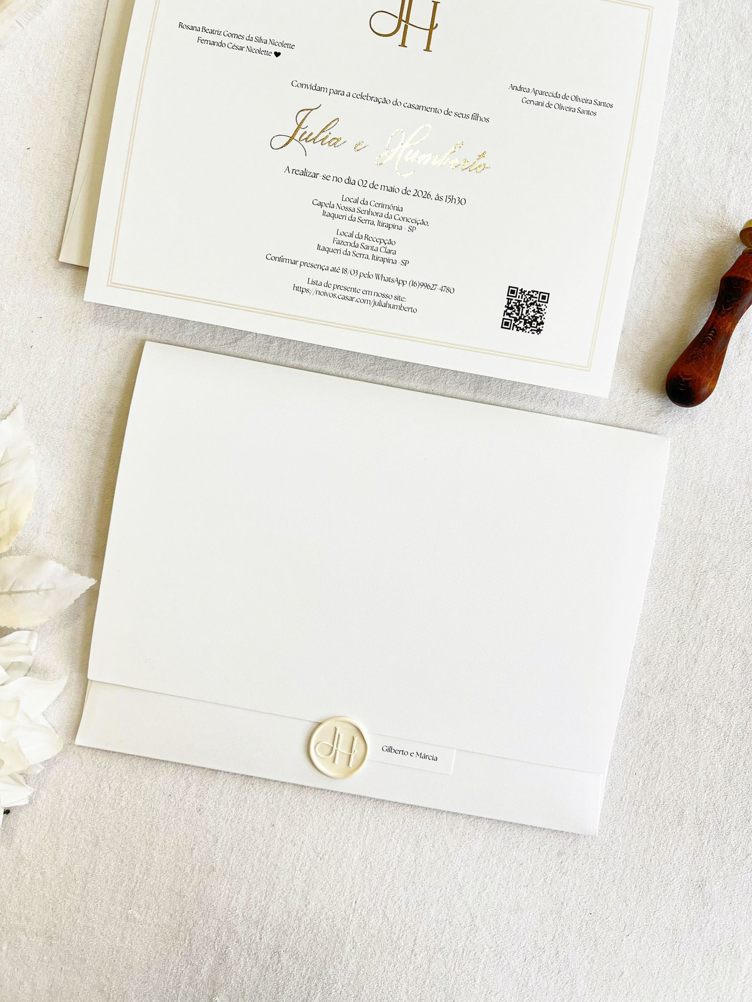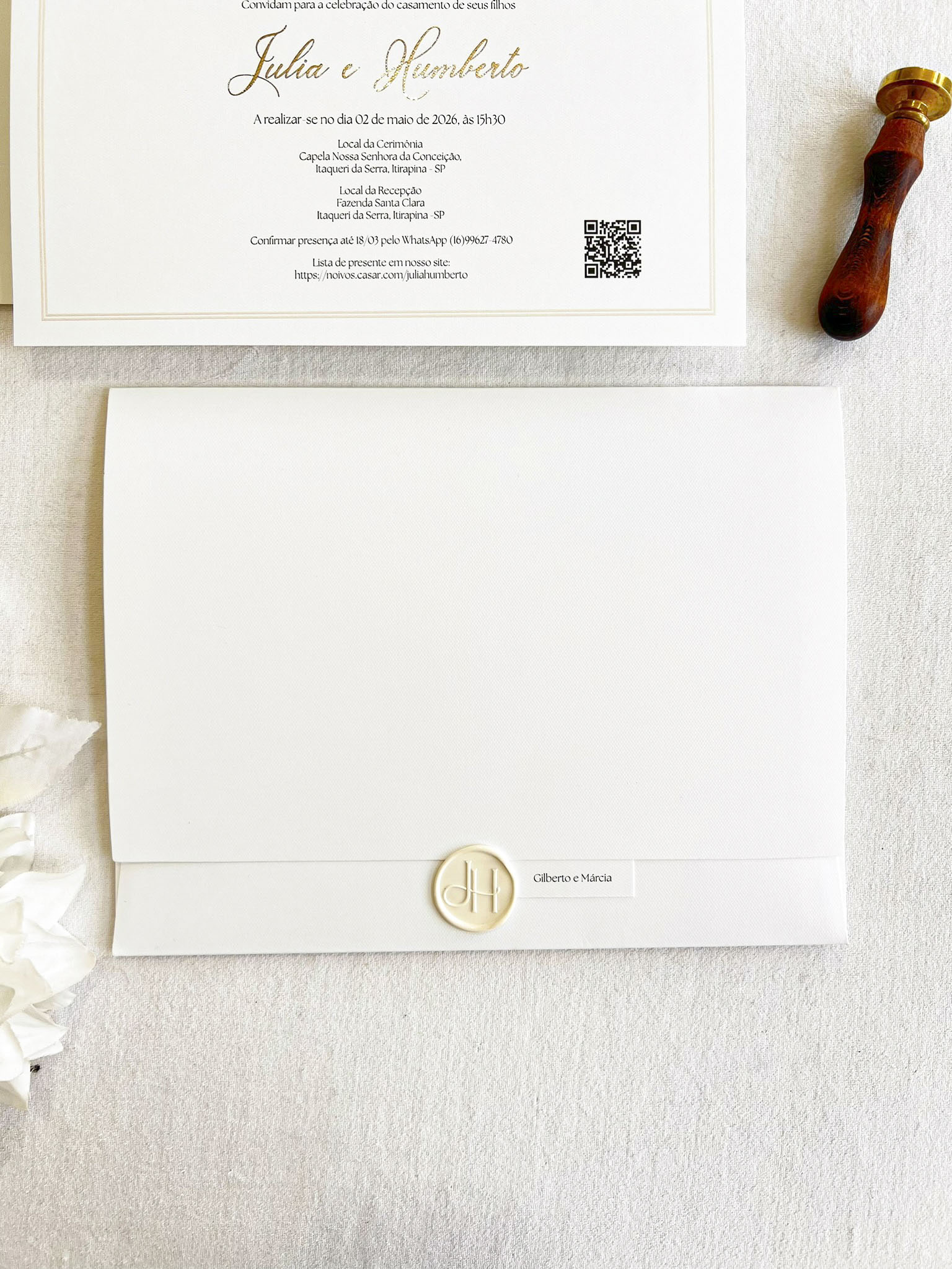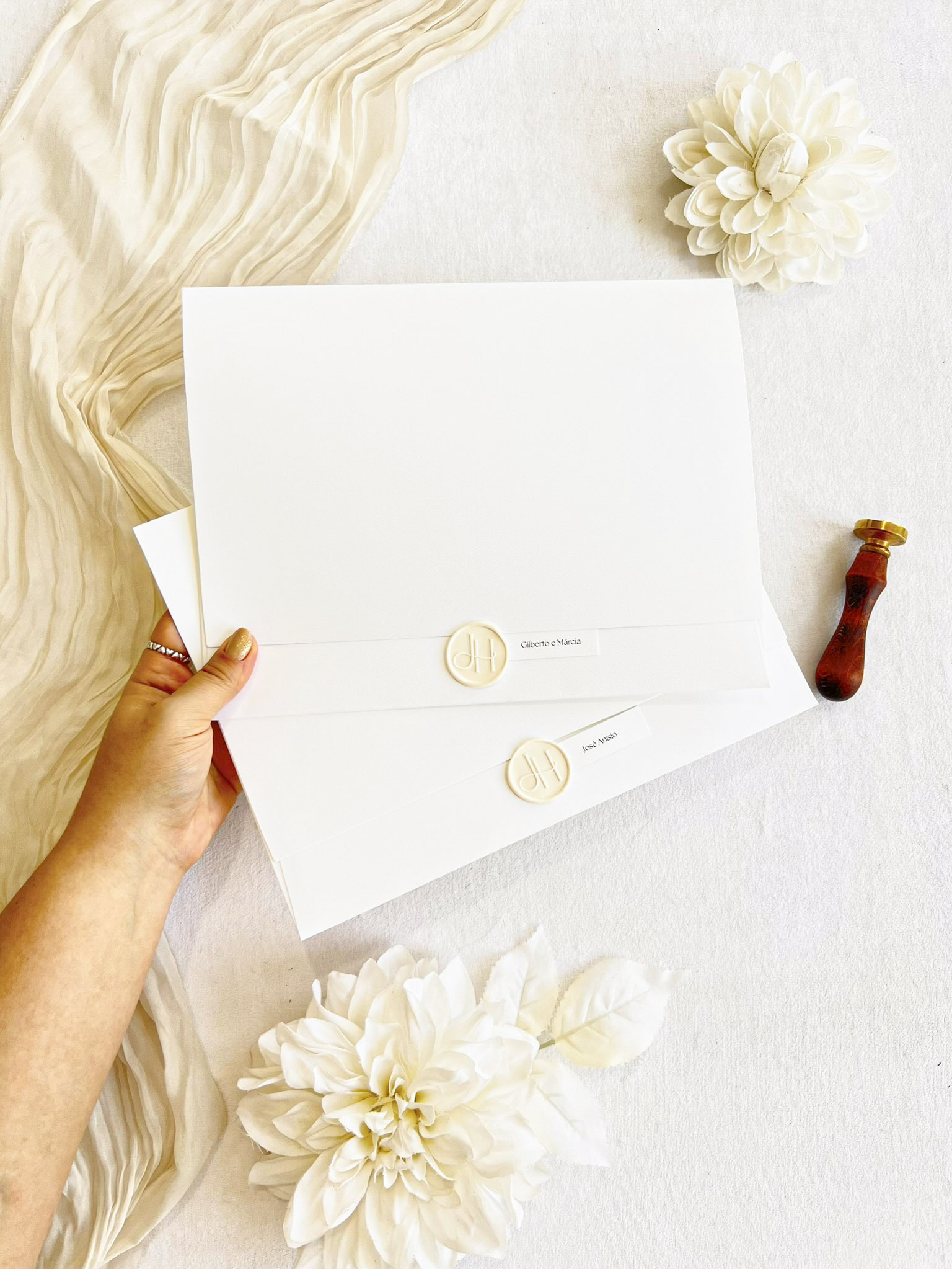 Neste modelo, o casal optou pelo lacre de cera personalizado com as iniciais. Caso deseje, você pode adicioná-lo ao seu pedido como um item adicional. clique aqui