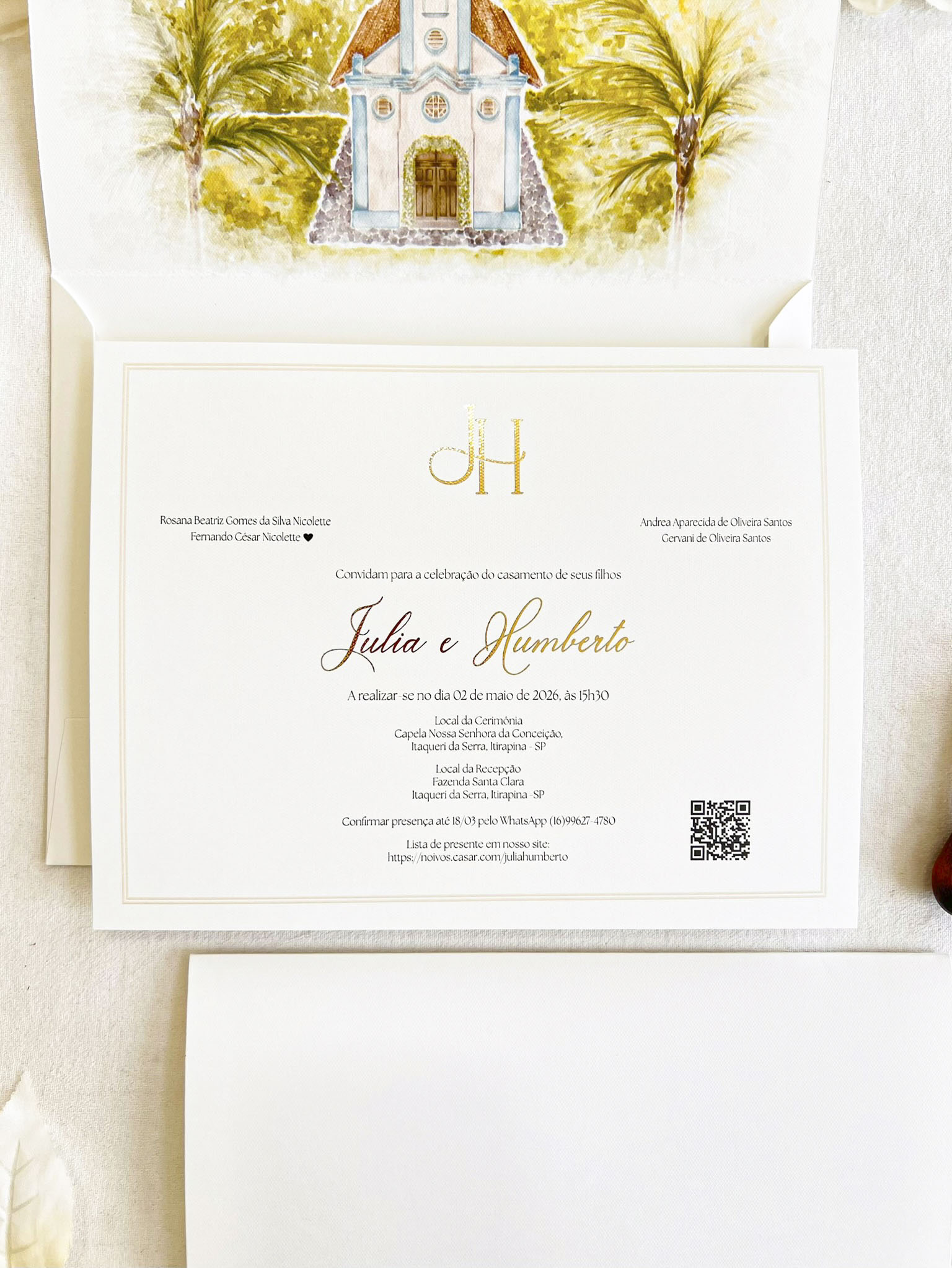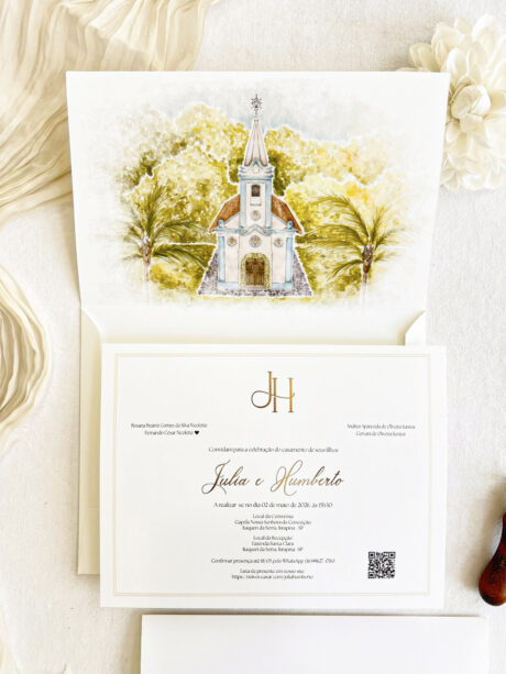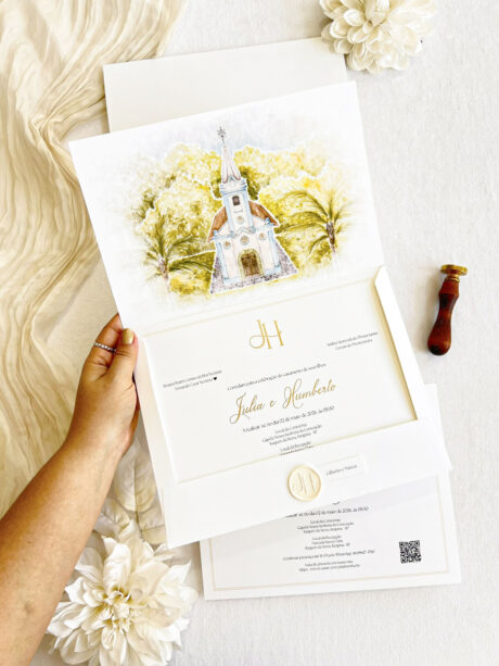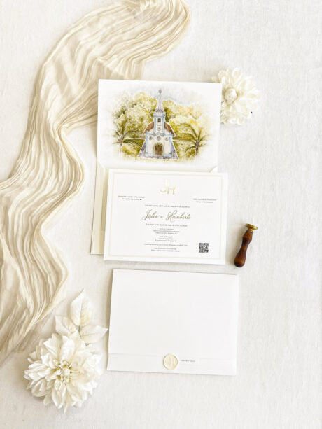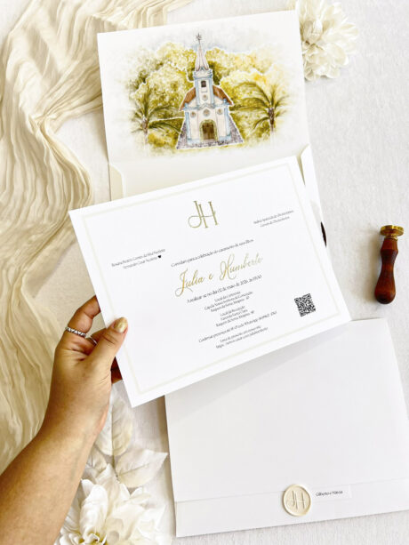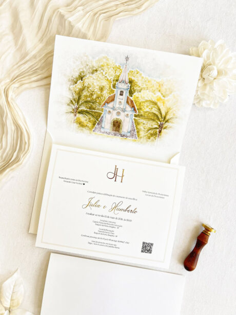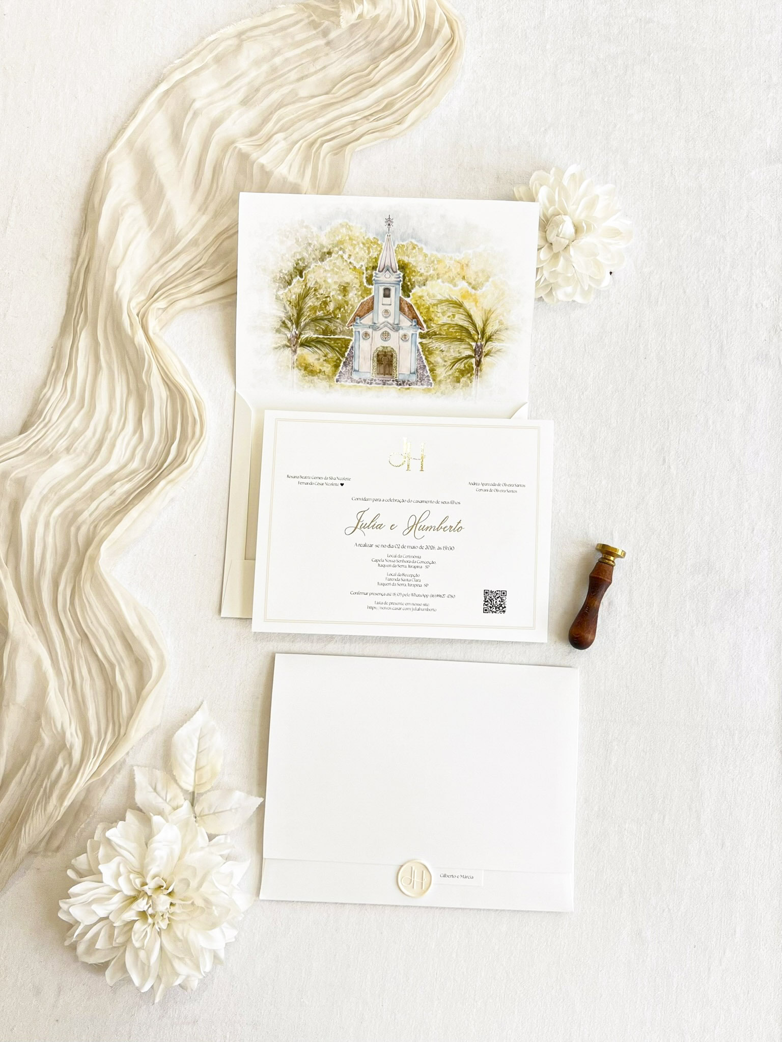 Neste modelo, o casal optou pelo lacre de cera personalizado com as iniciais. Caso deseje, você pode adicioná-lo ao seu pedido como um item adicional. clique aqui