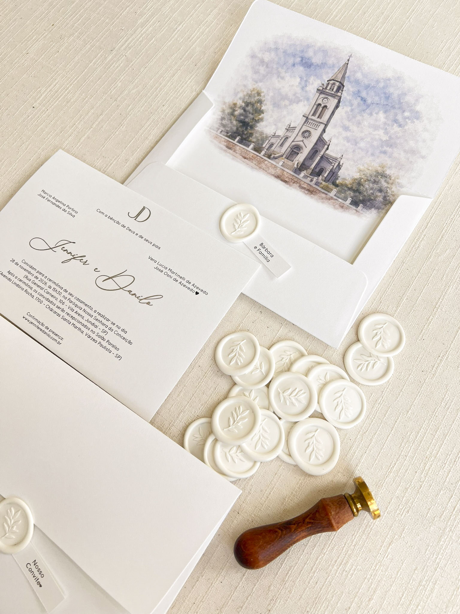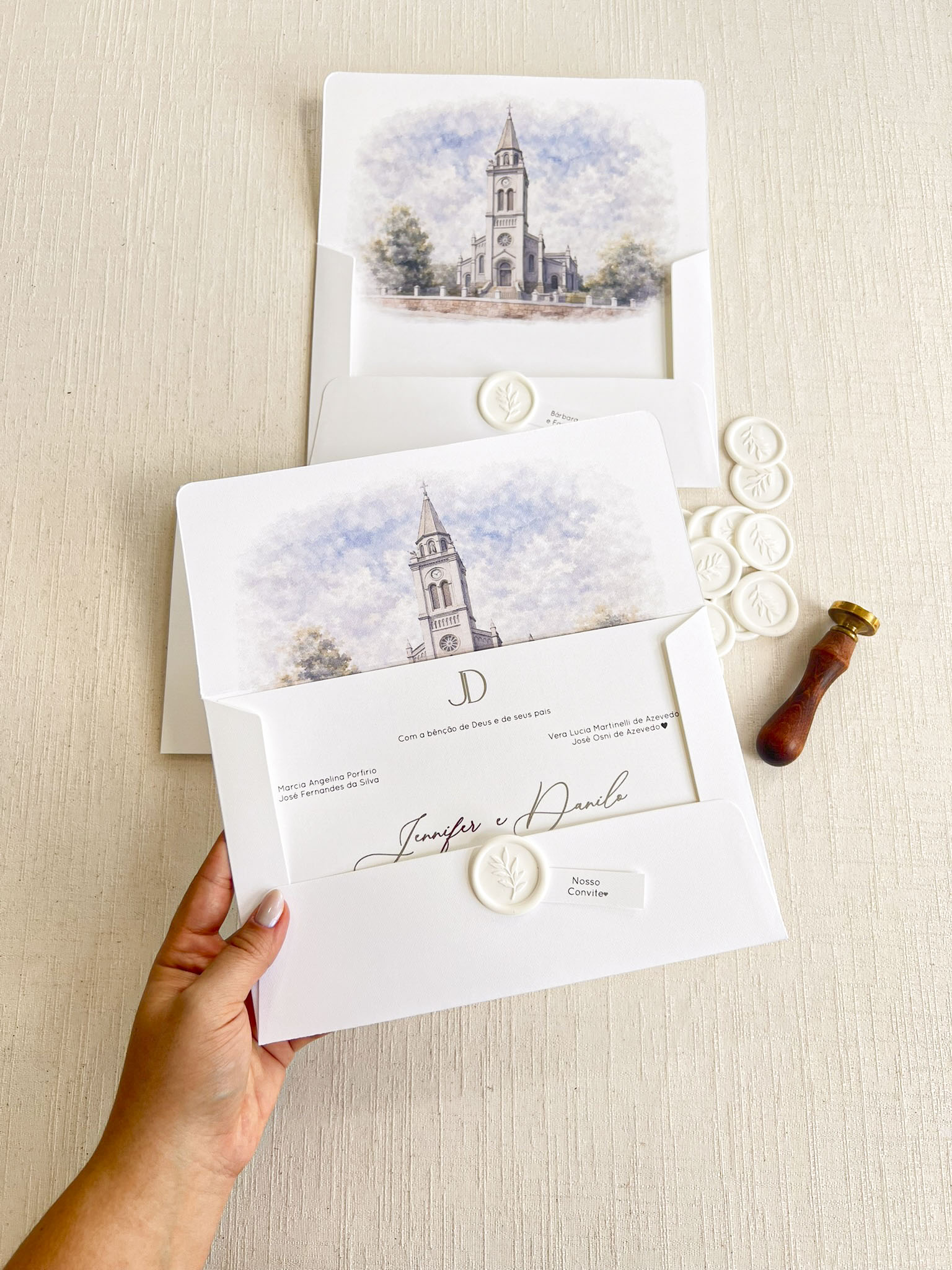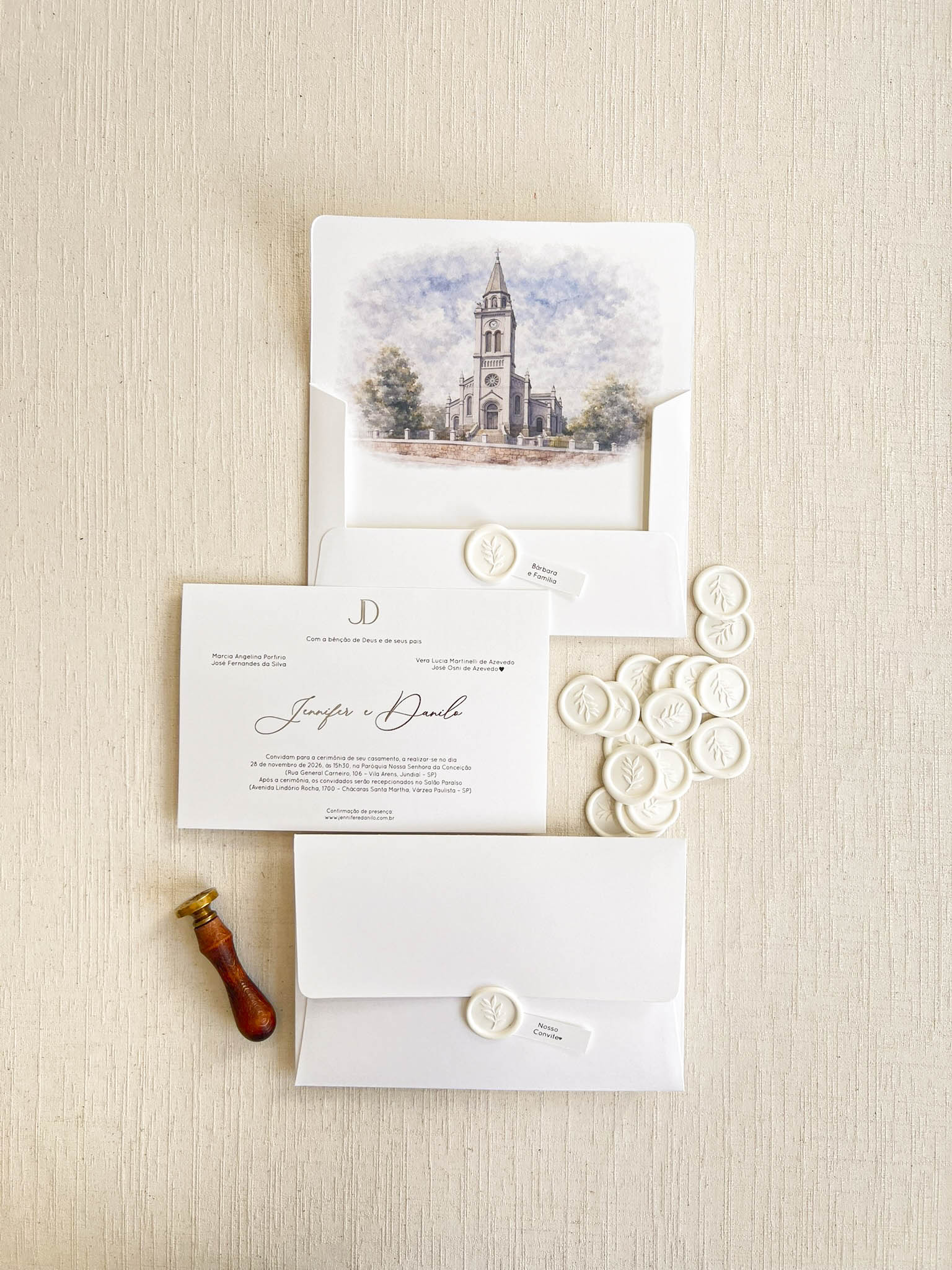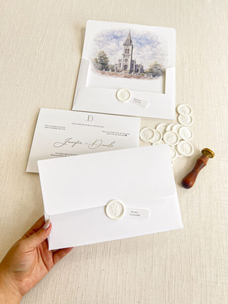 Você pode optar pelo lacre de cera personalizado com as iniciais. Caso deseje, você pode adicioná-lo ao seu pedido como um item adicional. clique aqui