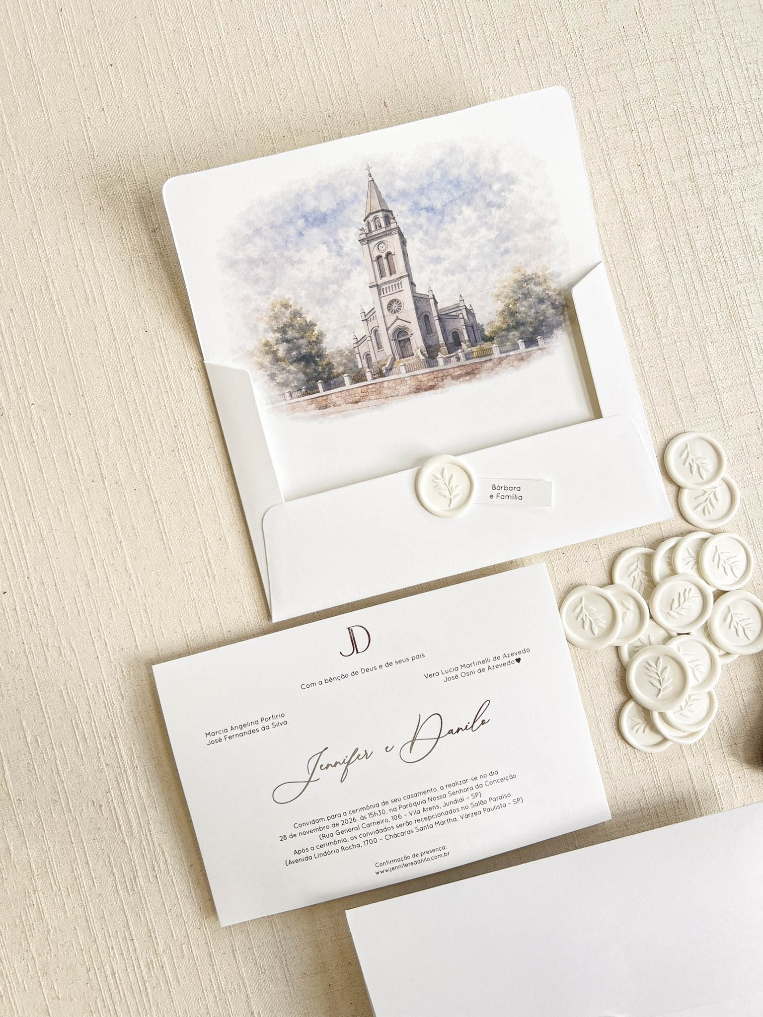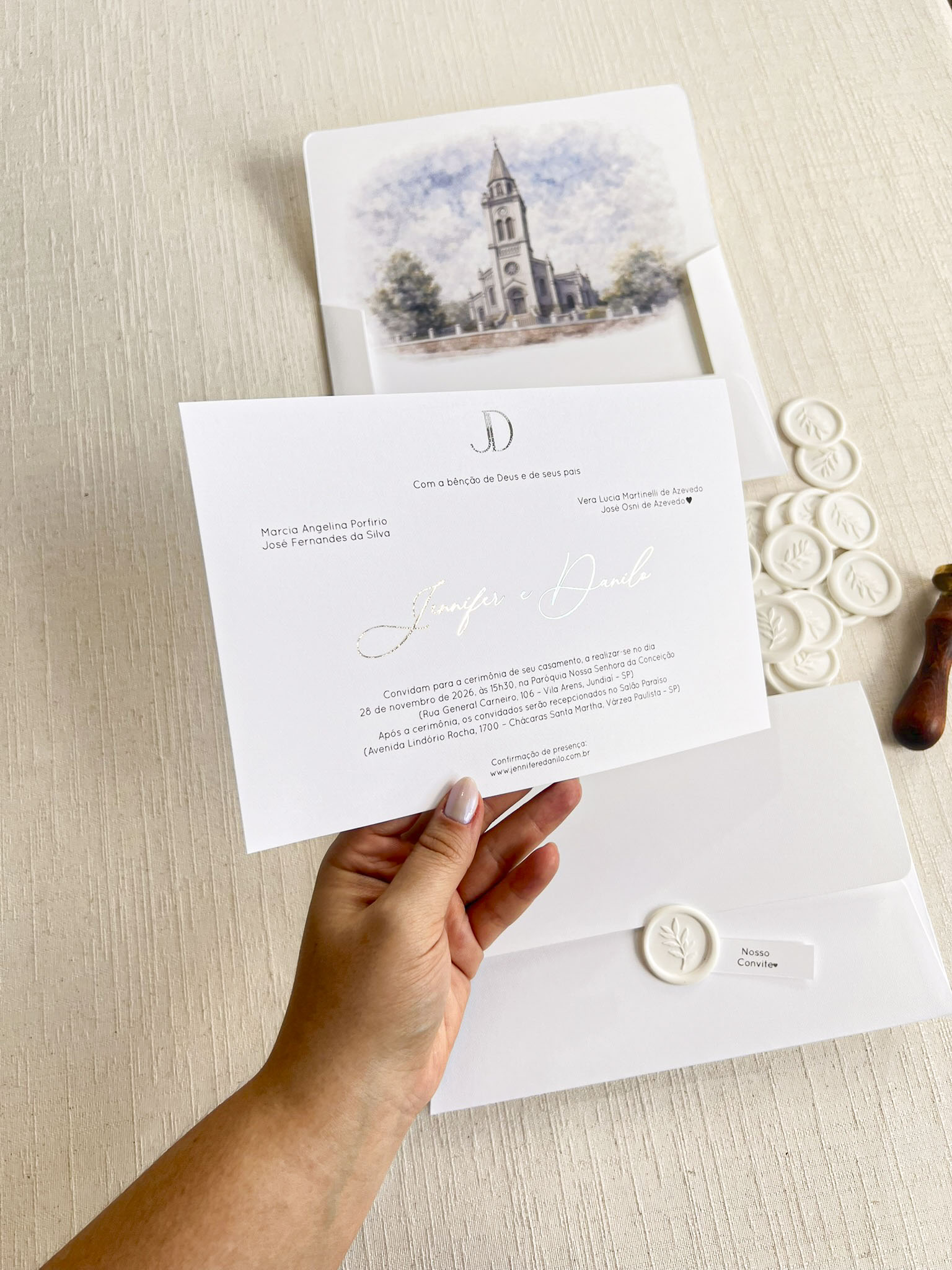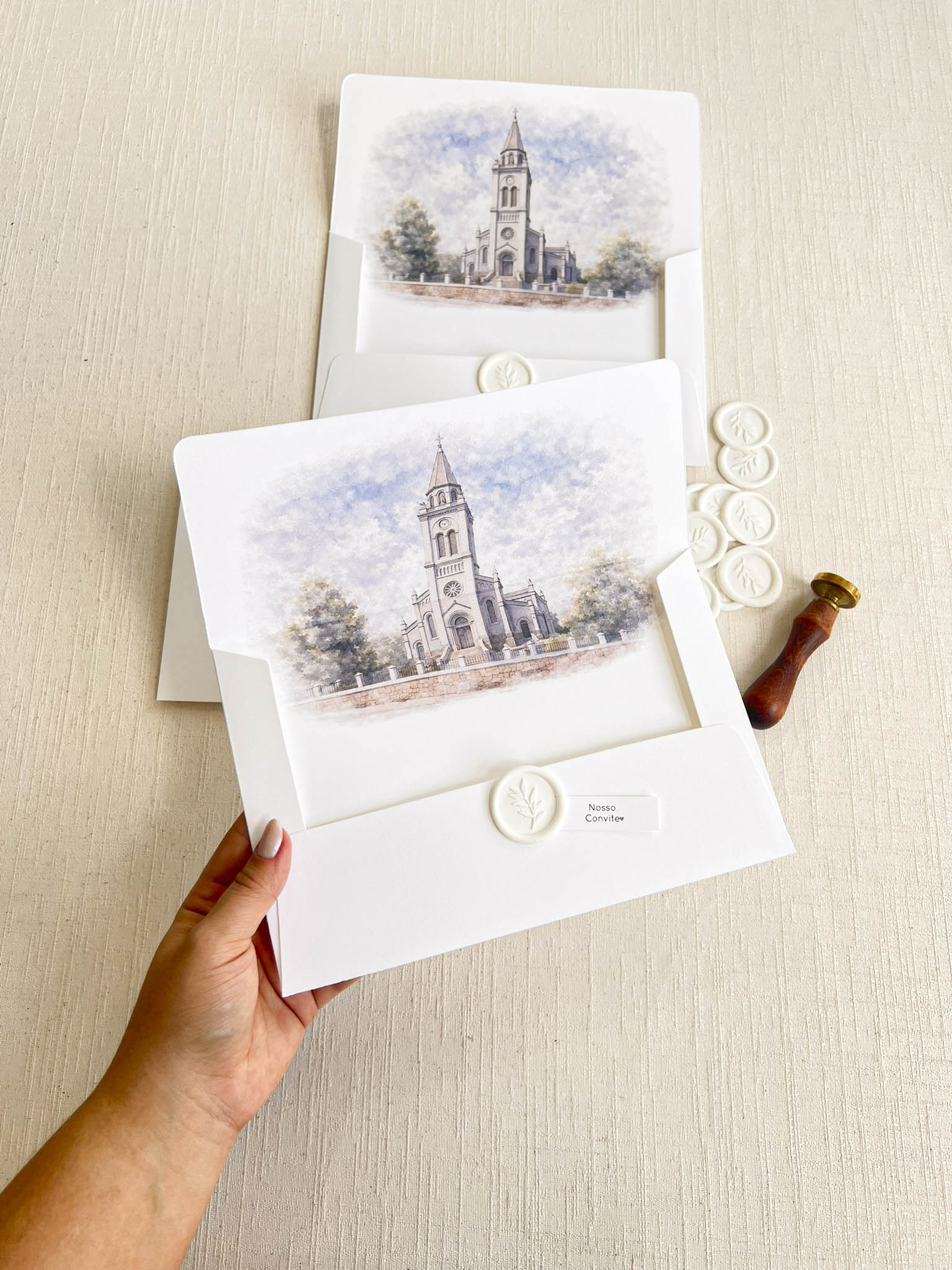 Você pode optar pelo lacre de cera personalizado com as iniciais. Caso deseje, você pode adicioná-lo ao seu pedido como um item adicional. clique aqui