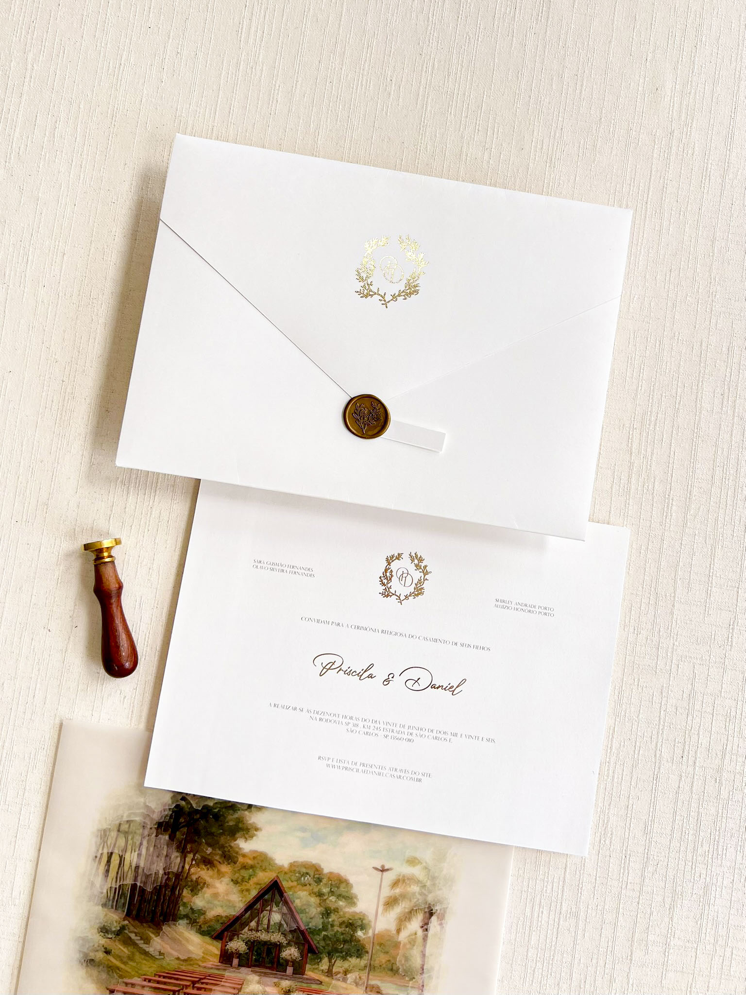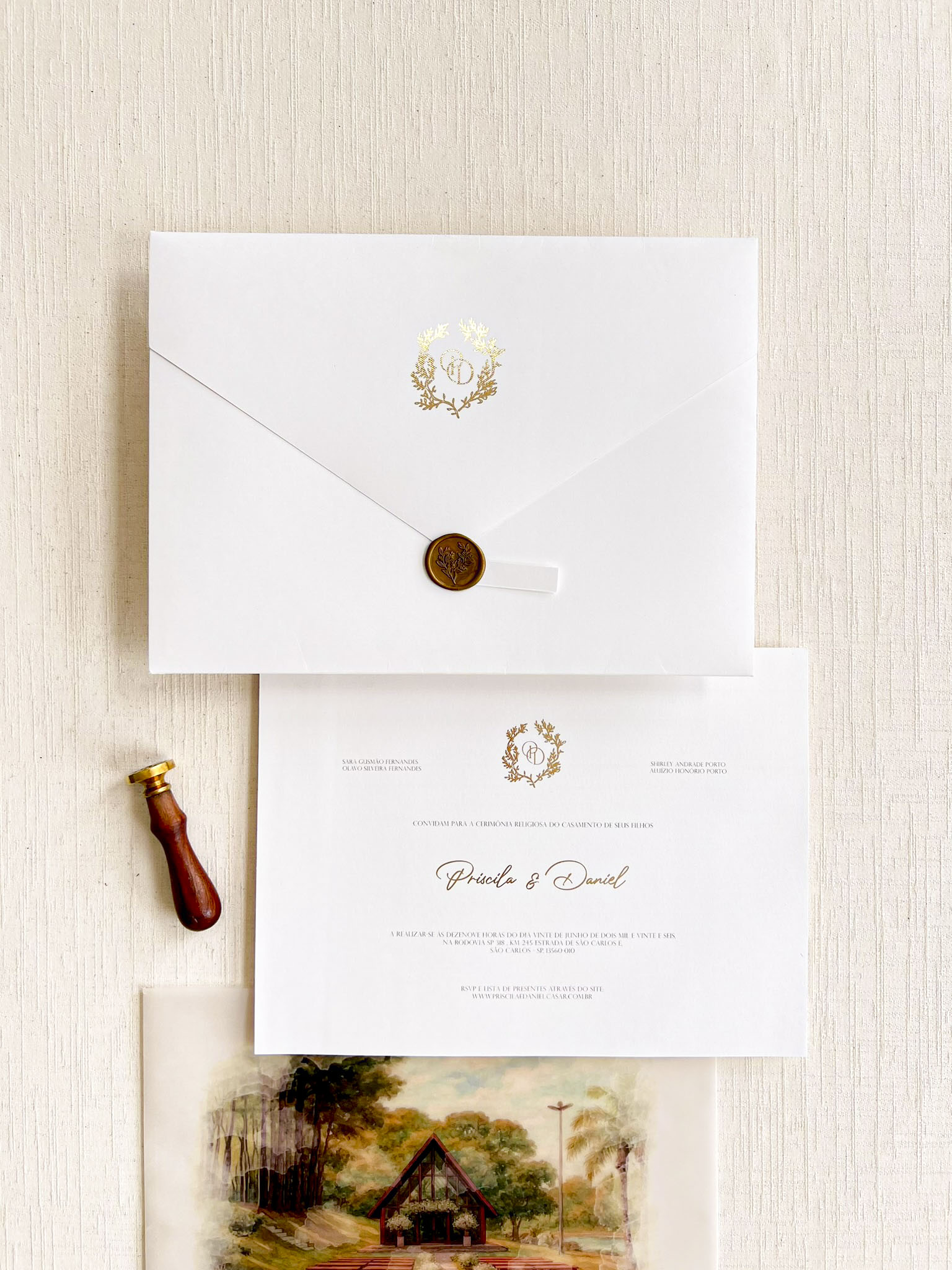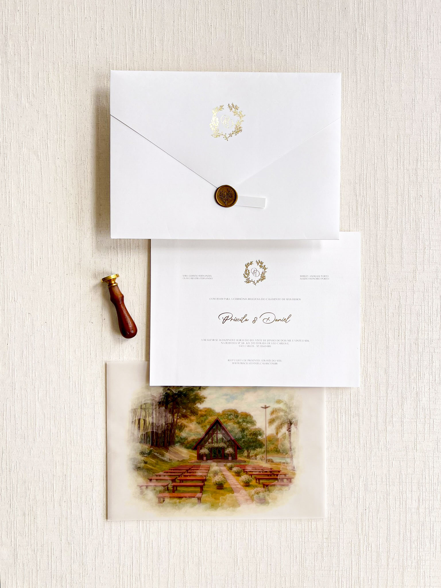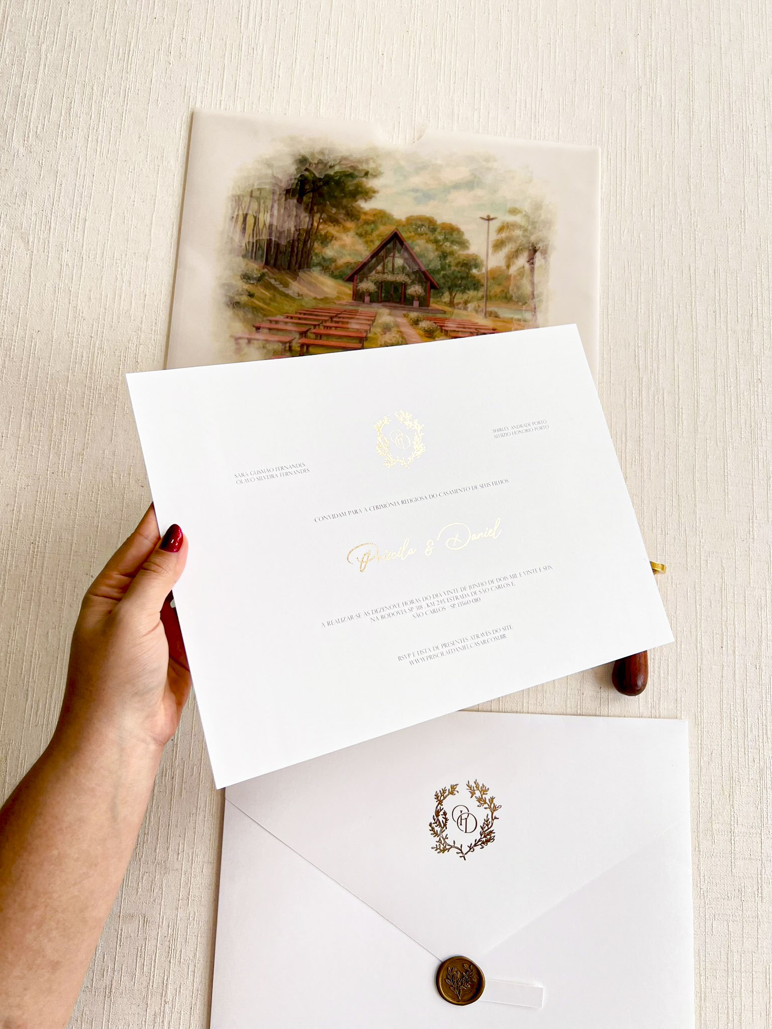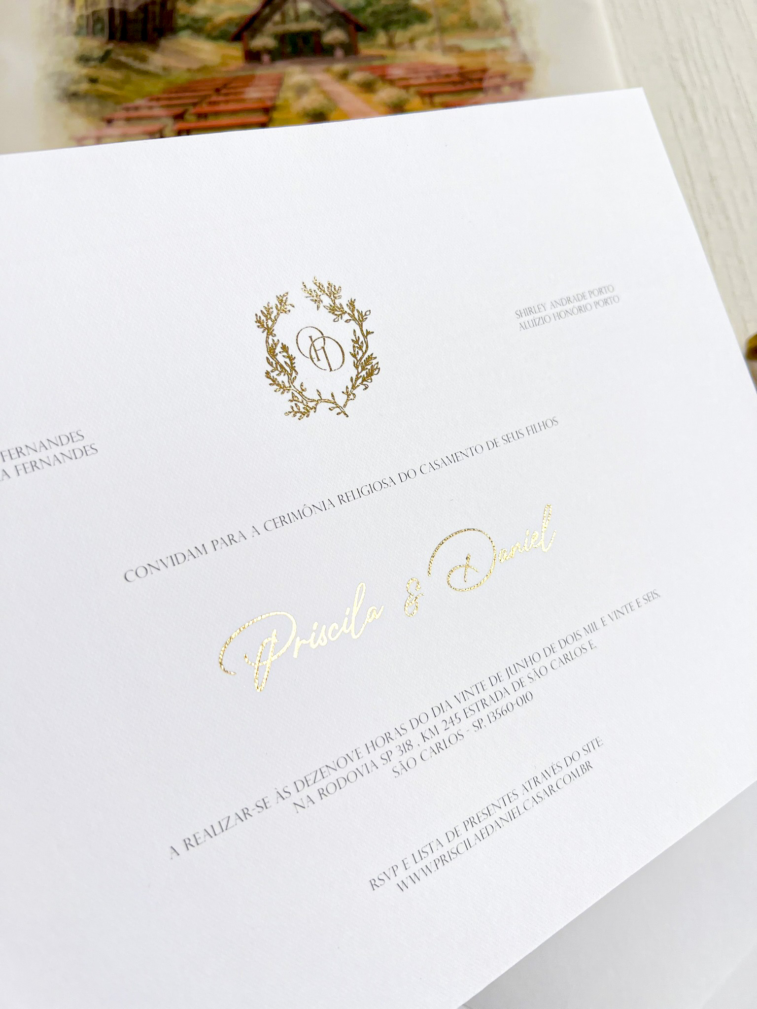 – Cartão convite texturizado 250g COM METALIZADO NOS NOMES E MONOGRAMA