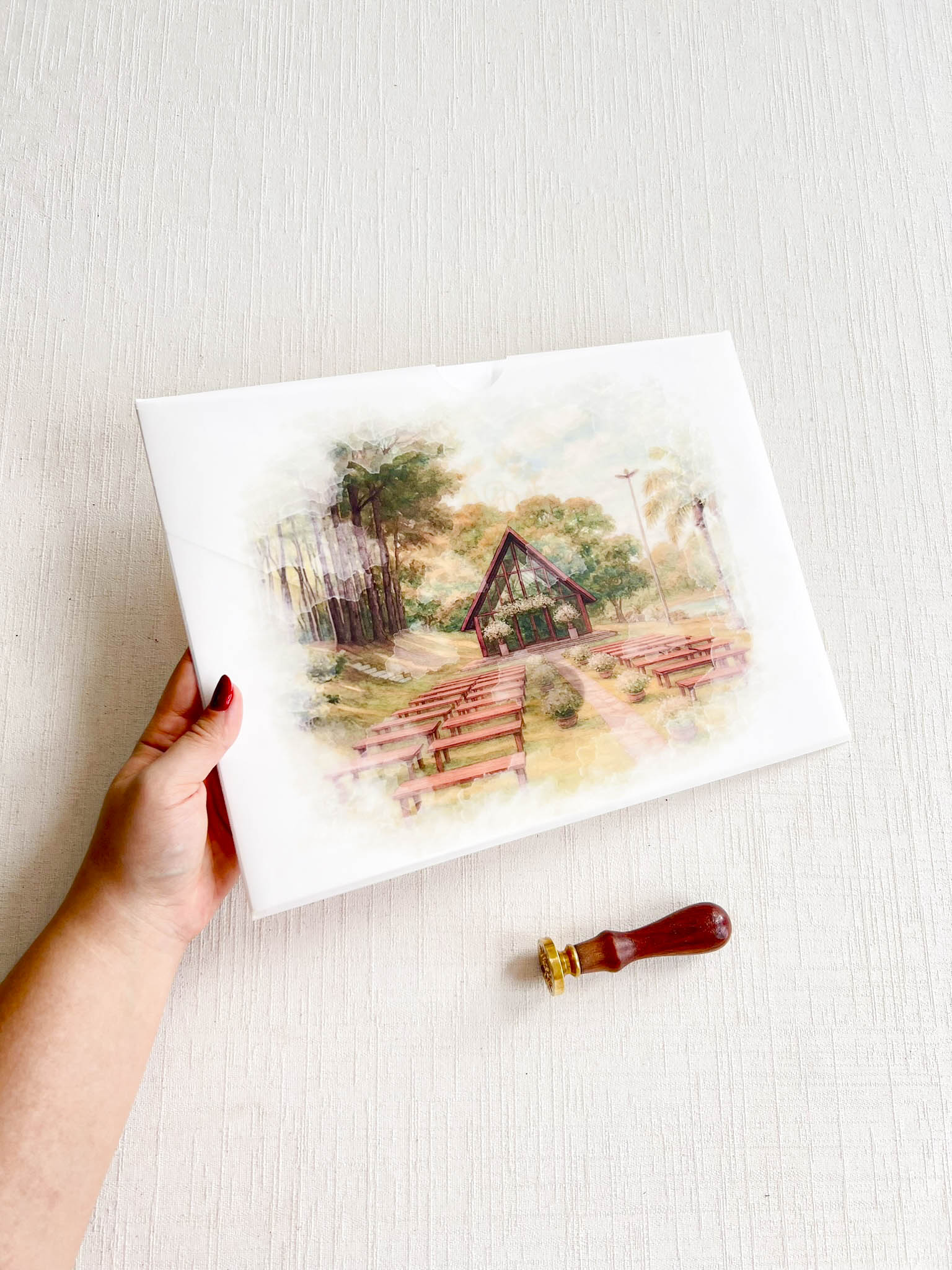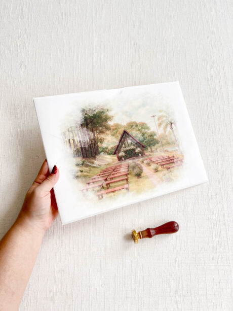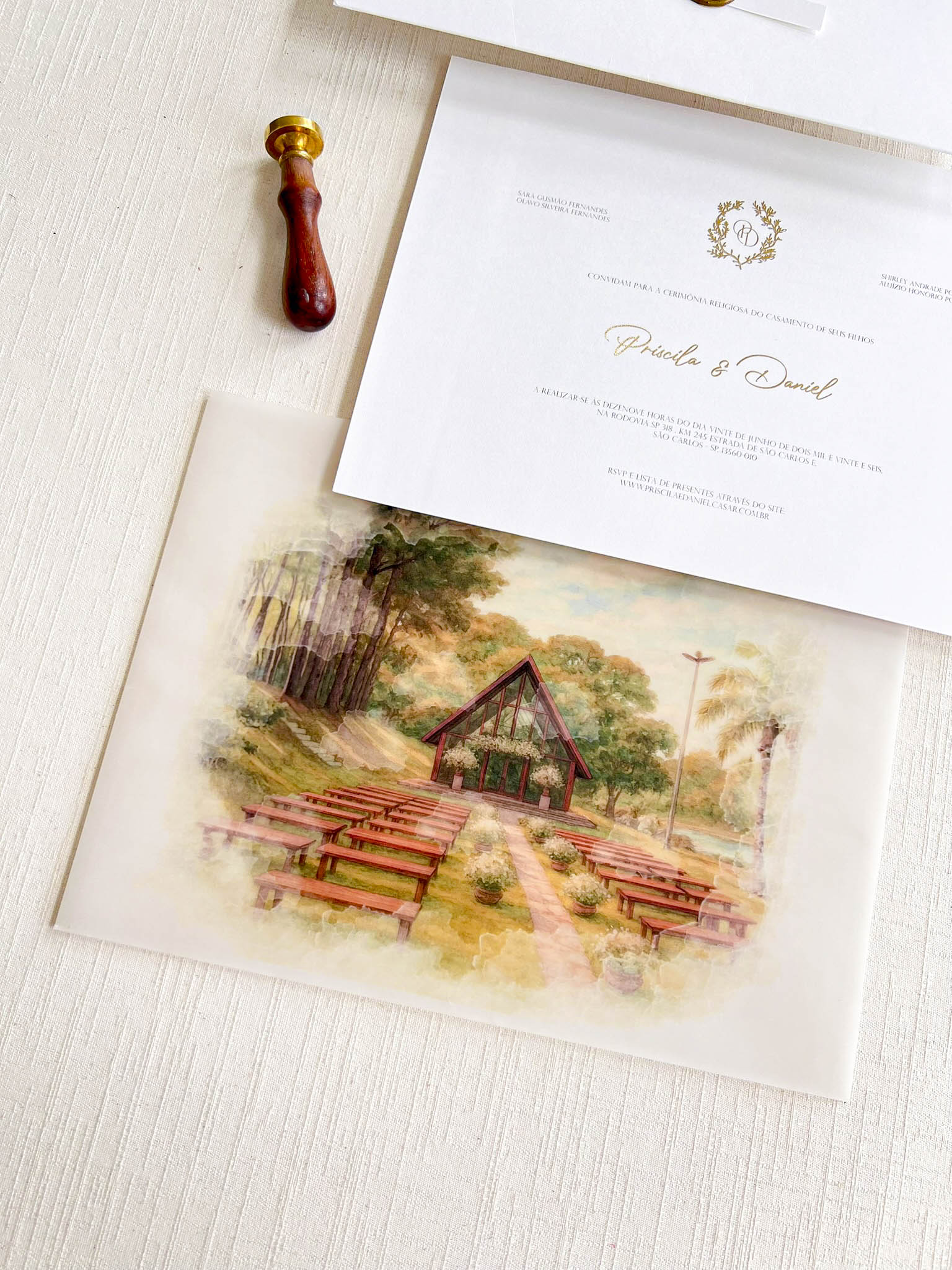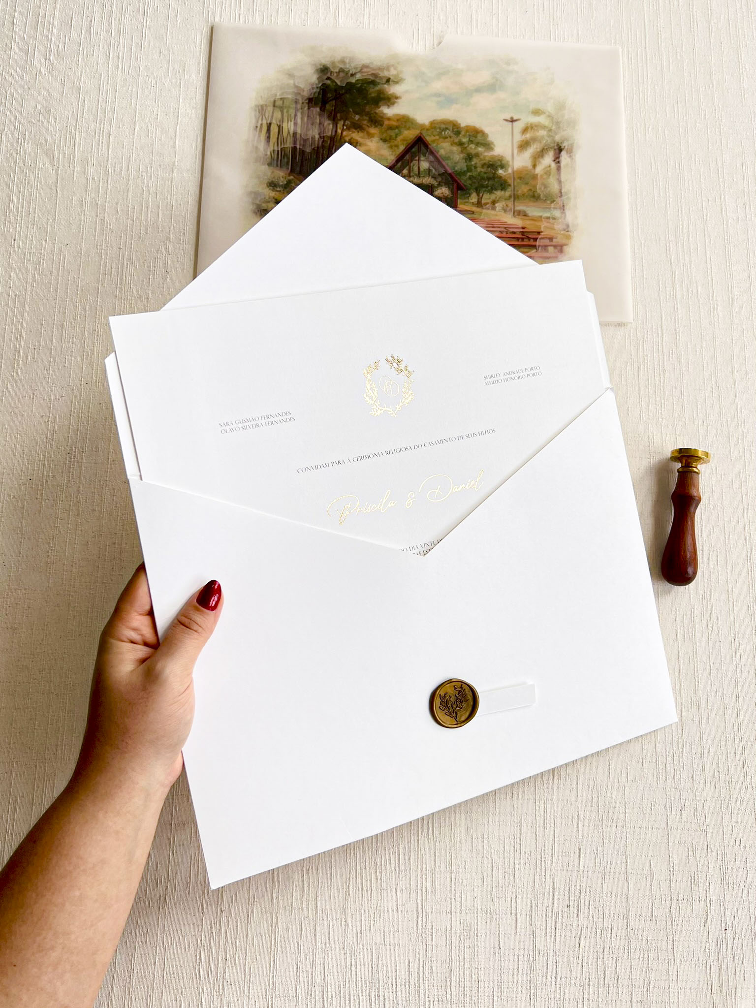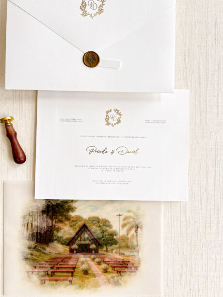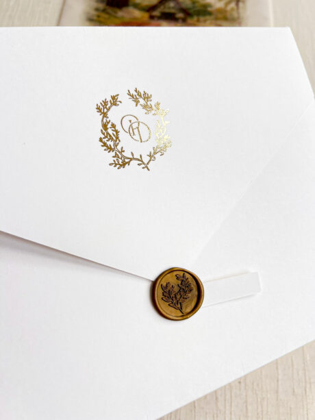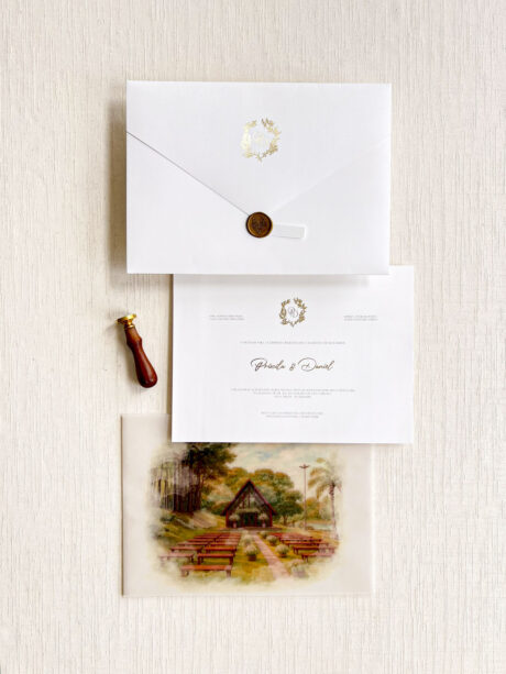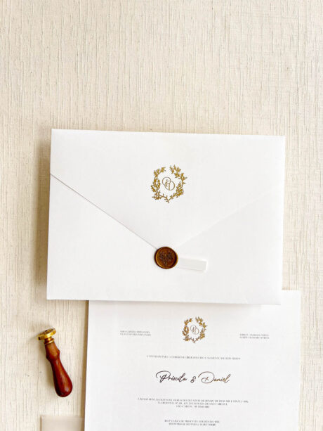 Você pode optar pelo lacre de cera personalizado com as iniciais. Caso deseje, você pode adicioná-lo ao seu pedido como um item adicional. clique aqui