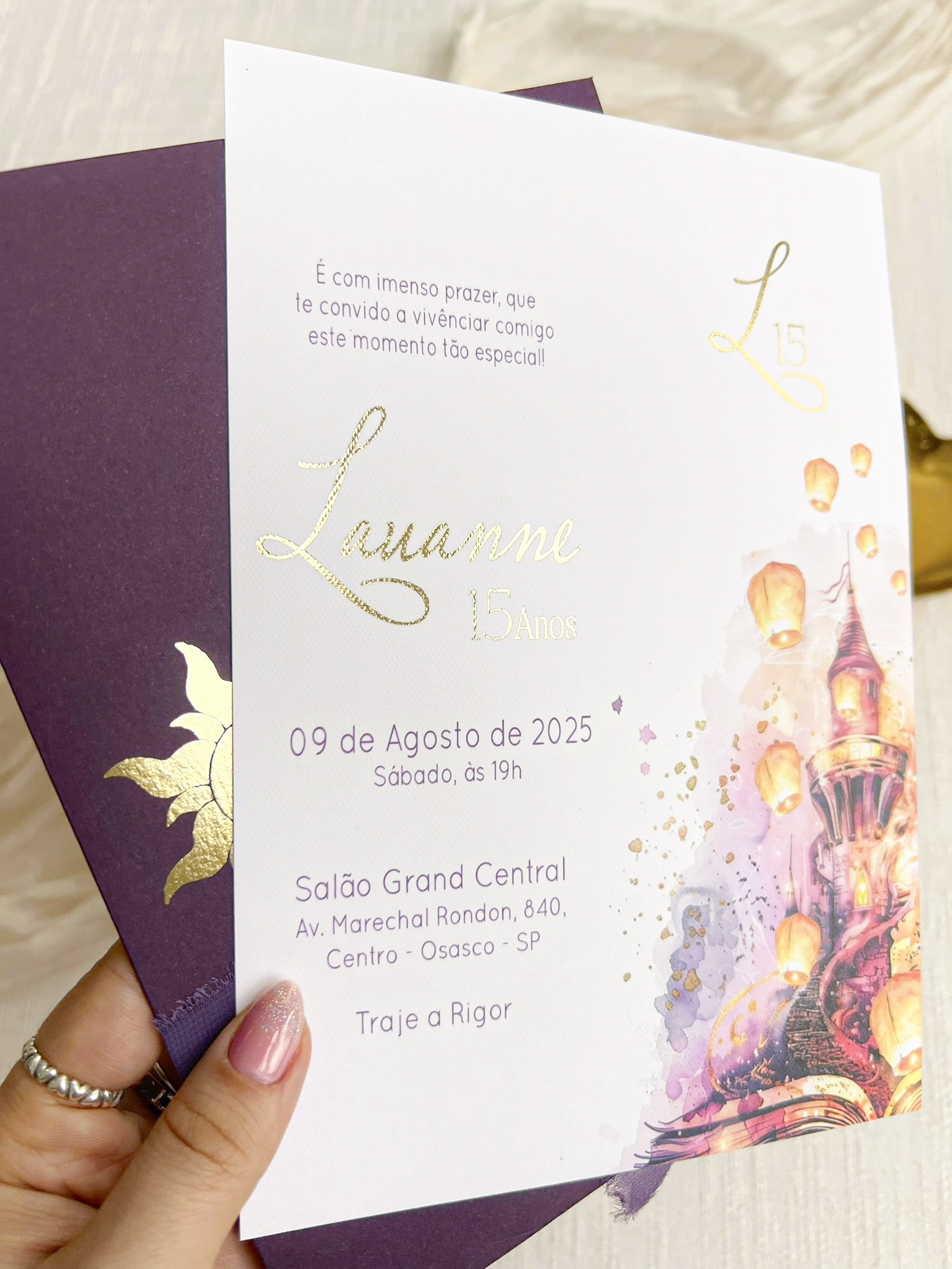 – Cartão convite texturizado 240g com METALIZADO NO NOME E INICIAL