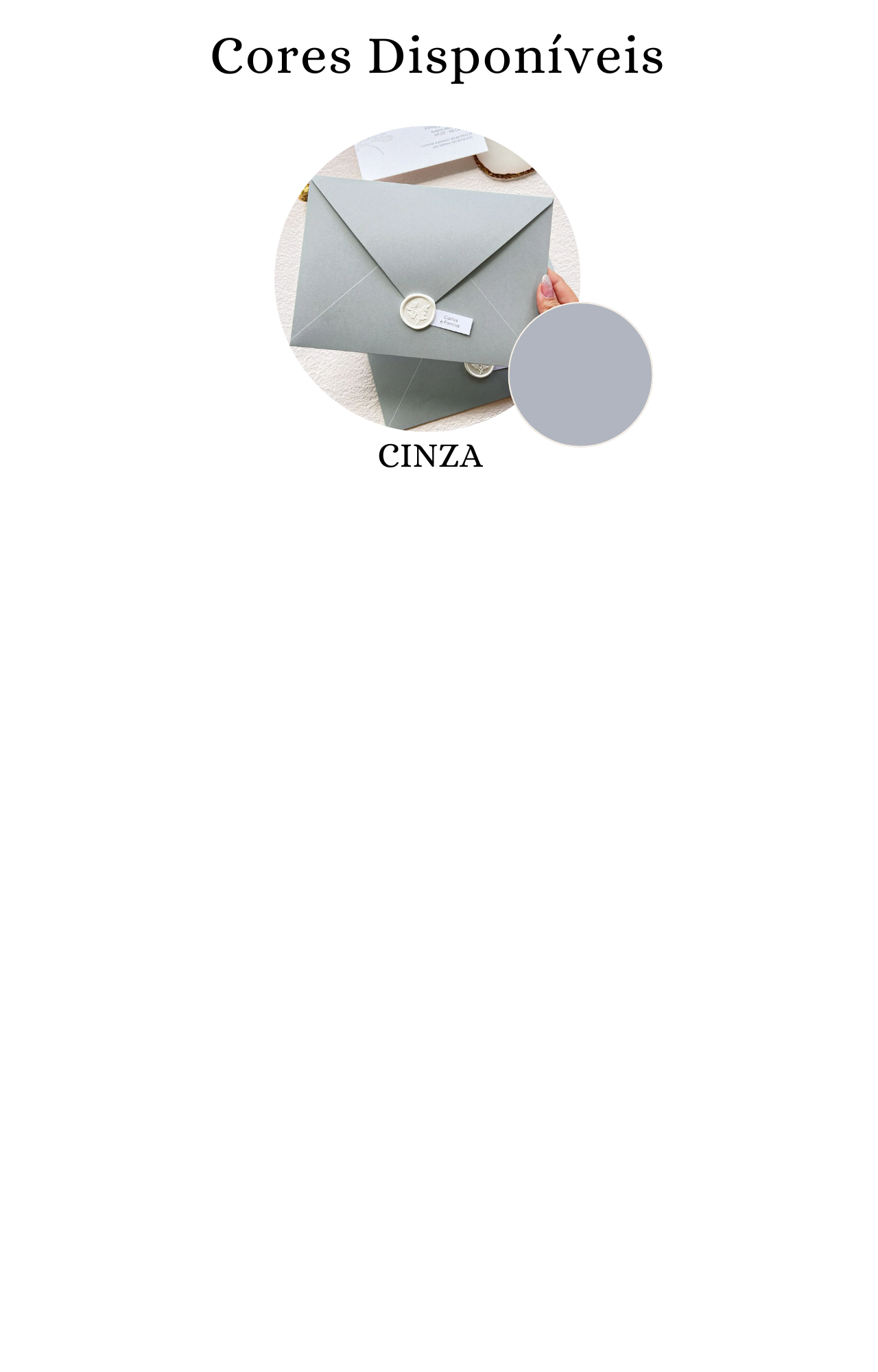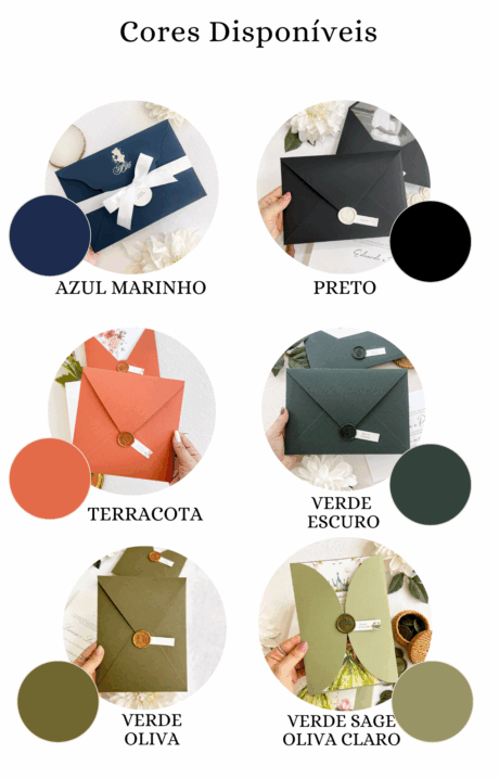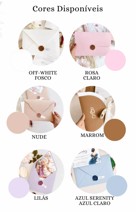 | COR DO ENVELOPE | VERDE OLIVA, VERDE ESCURO, ROSA BEBÊ, NUDE, LILÁS, AZUL CLARO, AZUL MARINHO, OFF-WHITE, CINZA CLARO, MARROM |