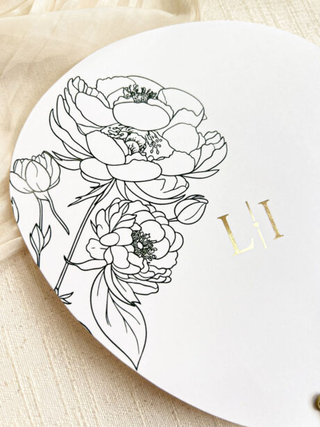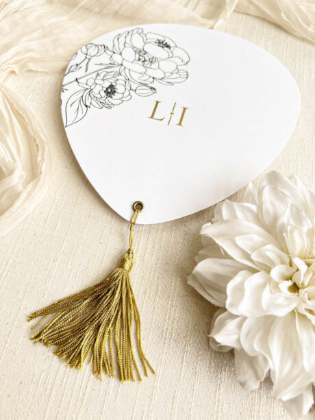 Produzido em papel off-white liso 250g com acabamento em rebite dourado e Pingente artesanal (cor à escolher) e iniciais em metalizado.