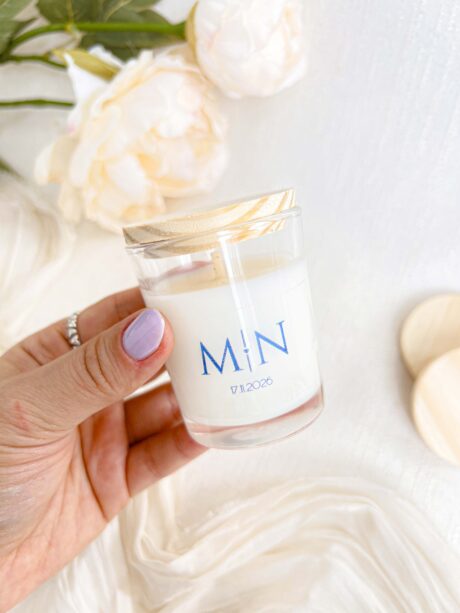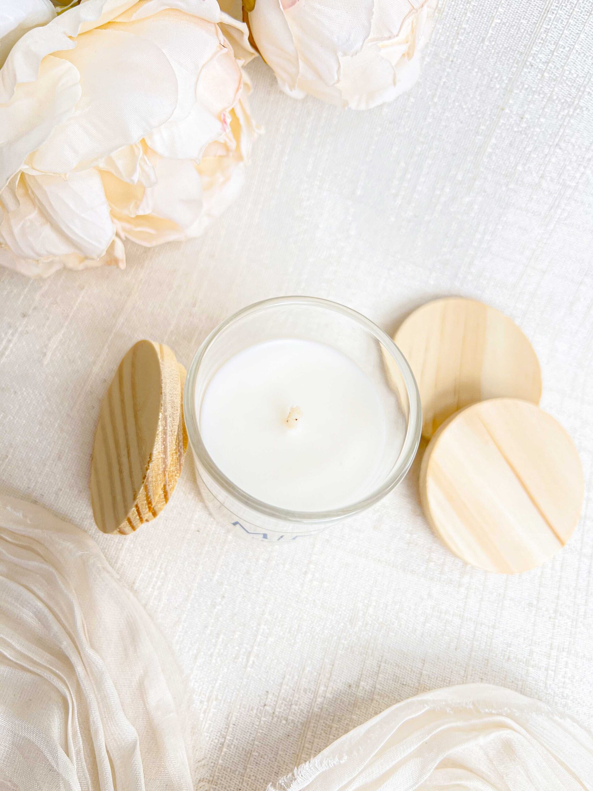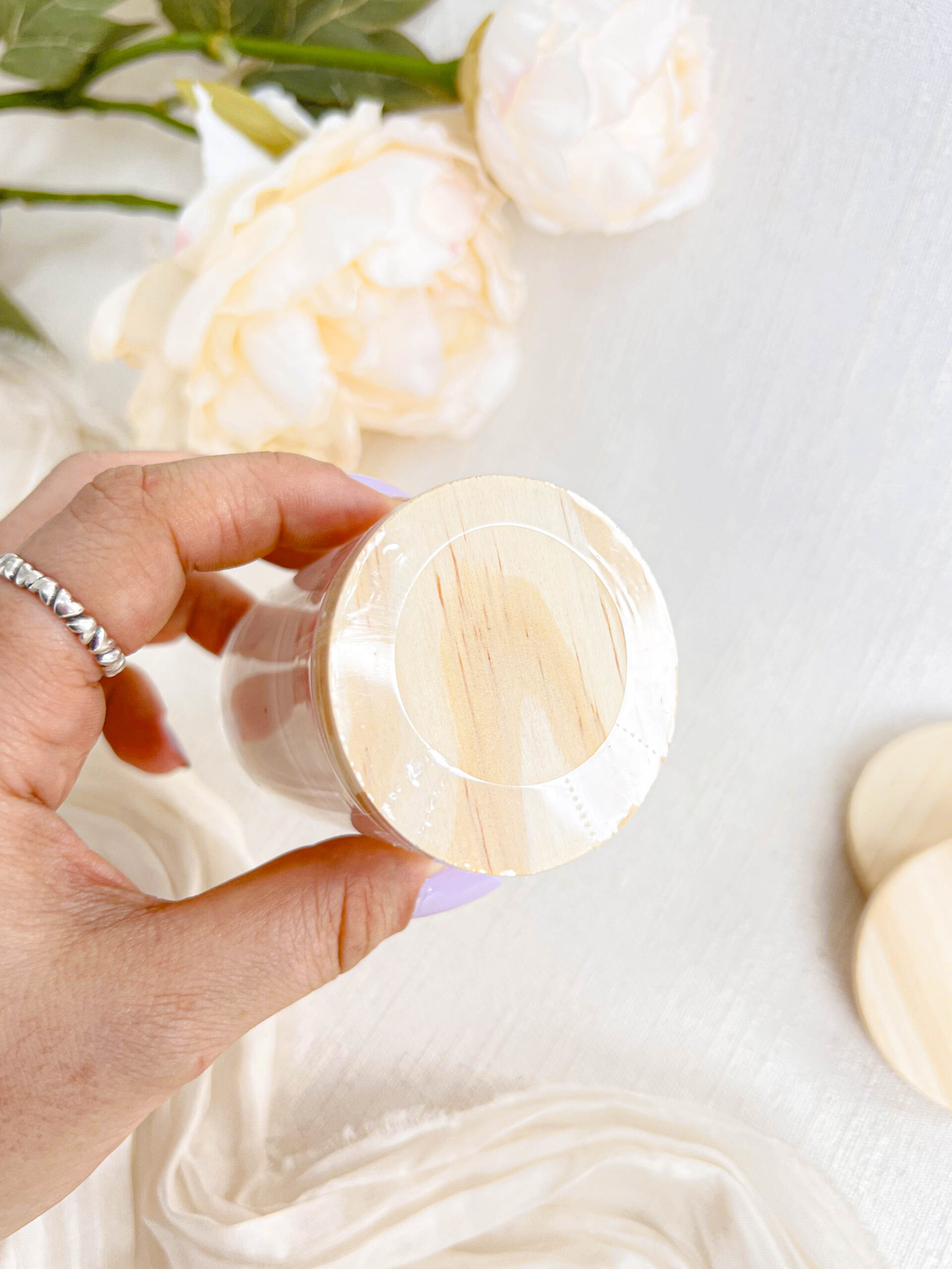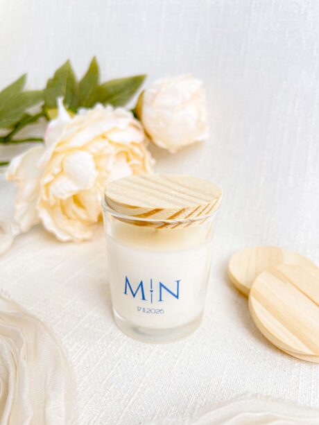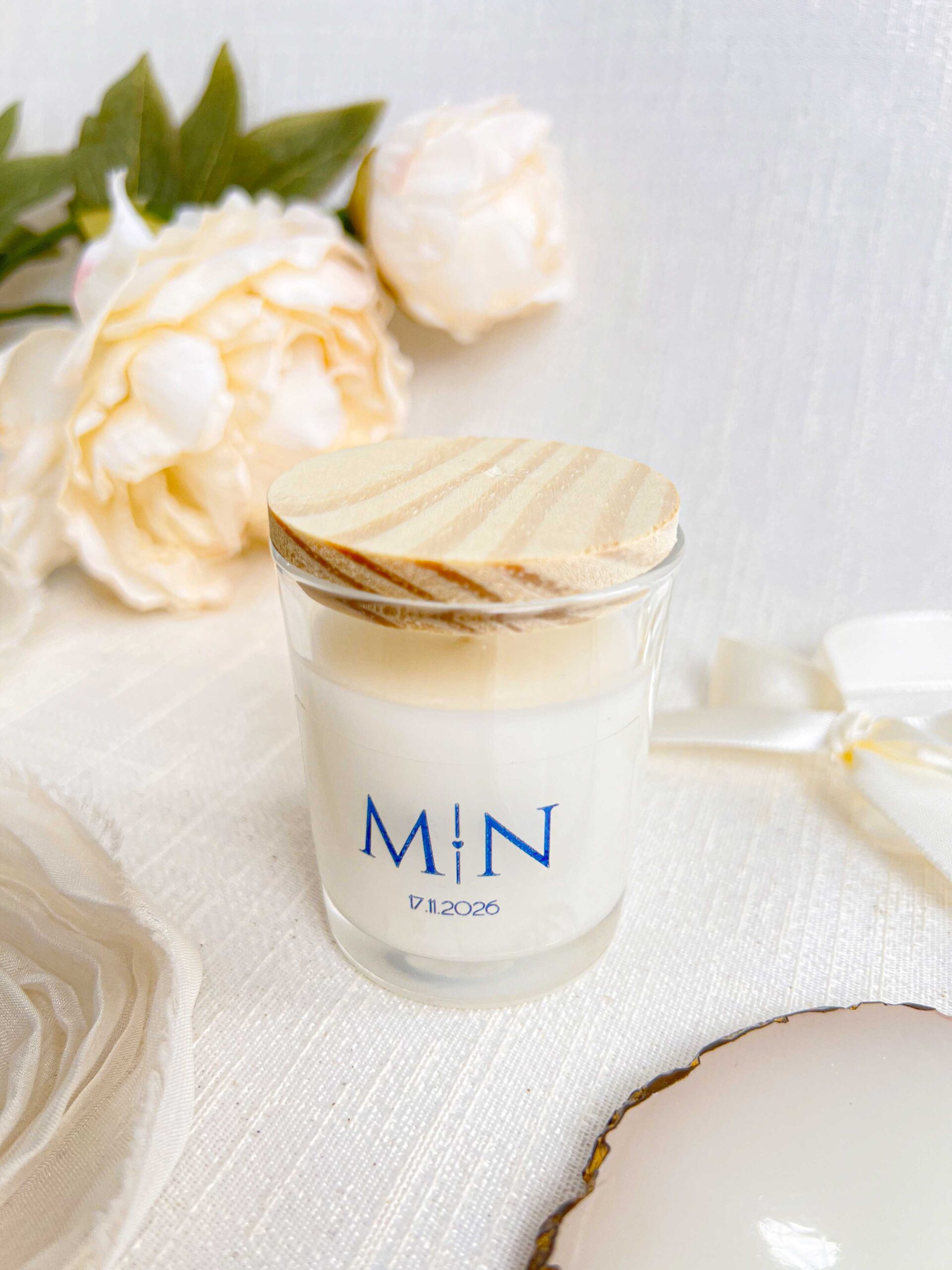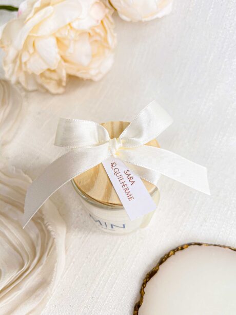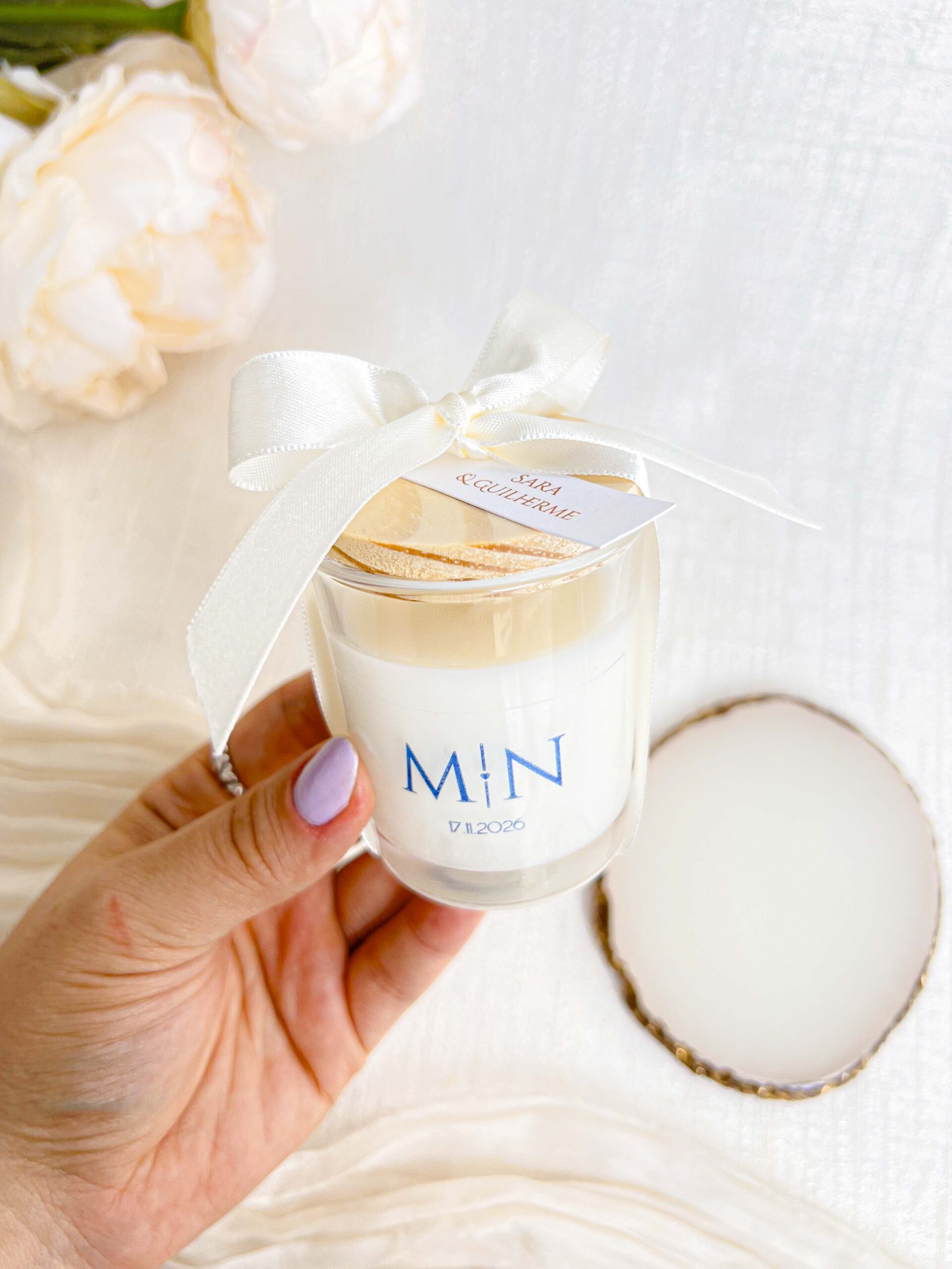 Cada vela acompanha tampa de madeira natural e etiqueta personalizada (padrão em fundo transparente, com impressão tradicional), garantindo elegância e praticidade.